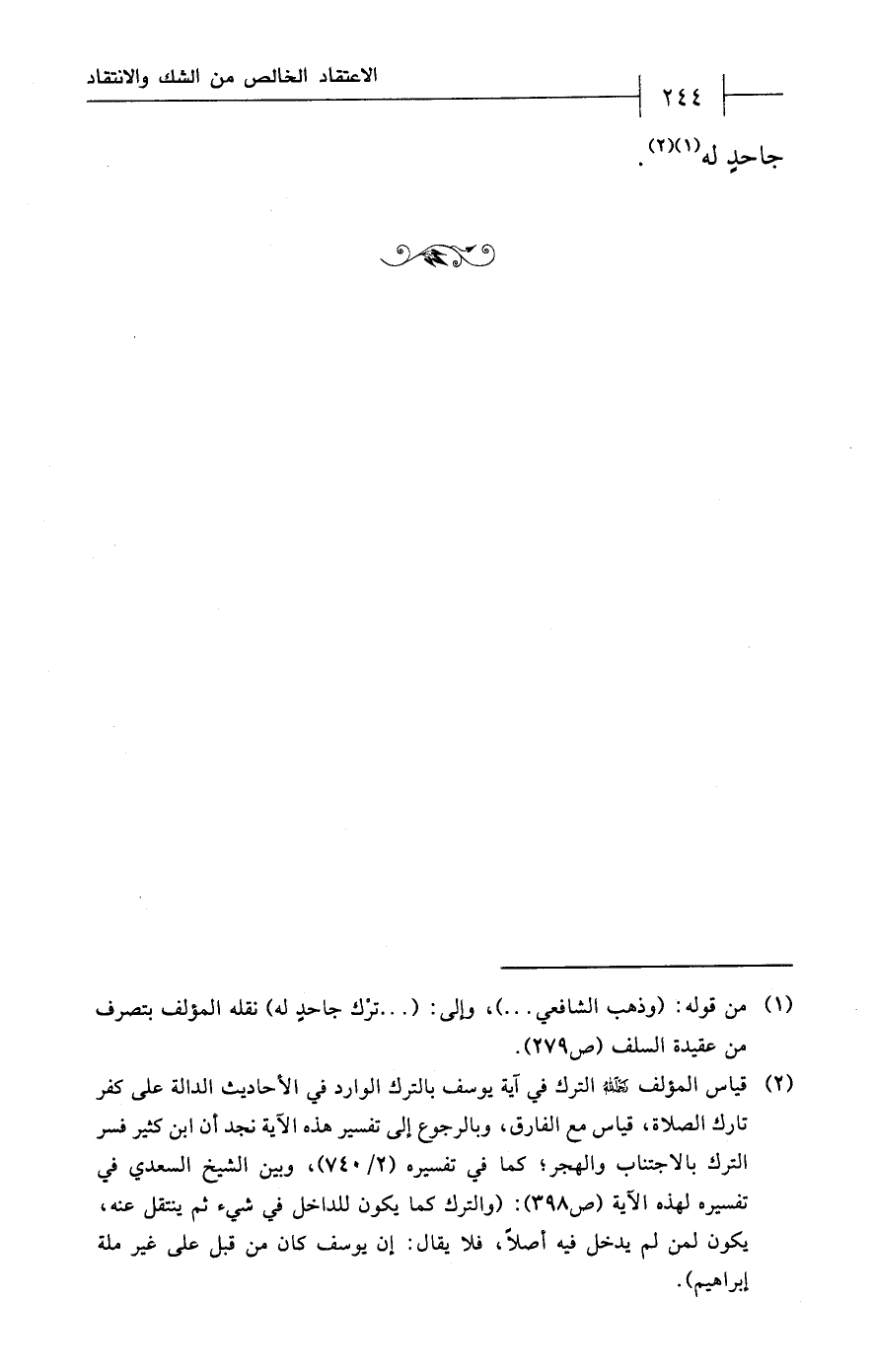 (¬1) من قوله: (وذهب الشافعي ...)، وإلى: (... ترْك جاحدٍ له) نقله المؤلف بتصرف من عقيدة السلف (ص 279).