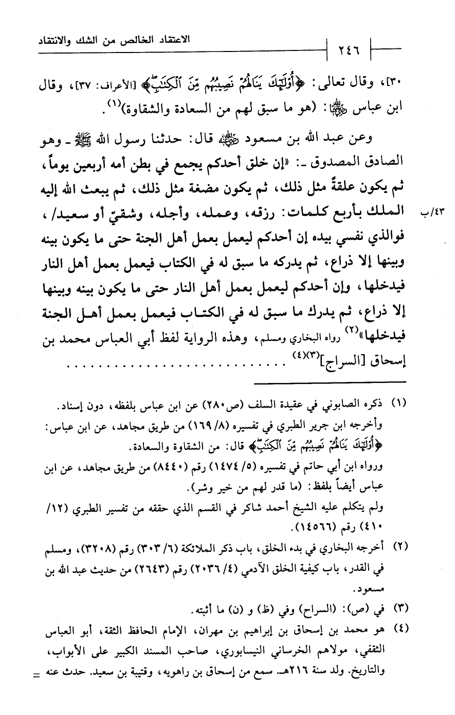 وعن عبد الله بن مسعود - رضي الله عنه - قال: حدثنا رسول الله - صلى الله عليه وسلم - وهو الصادق المصدوق -: "إن خلق أحدكم يجمع في بطن أمه أربعين يوماً، ثم يكون علقةً مثل ذلك، ثم يكون مضغة مثل ذلك، ثم يبعث الله إليه الملك بأربع كلمات: رزقه، وعمله، وأجله، وشقيّ أو سعيد، فوالذي نفسي بيده إن أحدكم ليعمل بعمل أهل الجنَّة حتى ما يكون بينه وبينها إلا ذراع، ثم يدركه ما سبق له في الكتاب فيعمل بعمل أهل النّار فيدخلها، وإن أحدكم ليعمل بعمل أهل النّار حتى ما يكون بينه وبينها إلا ذراع، ثم يدرك ما سبق له في الكتاب فيعمل بعمل أهل الجنَّة فيدخلها" (¬2) رواه البخاريّ ومسلم، وهذه الرواية لفظ أبي العباس محمّد بن إسحاق [السراج] (¬3) (¬4) ............................