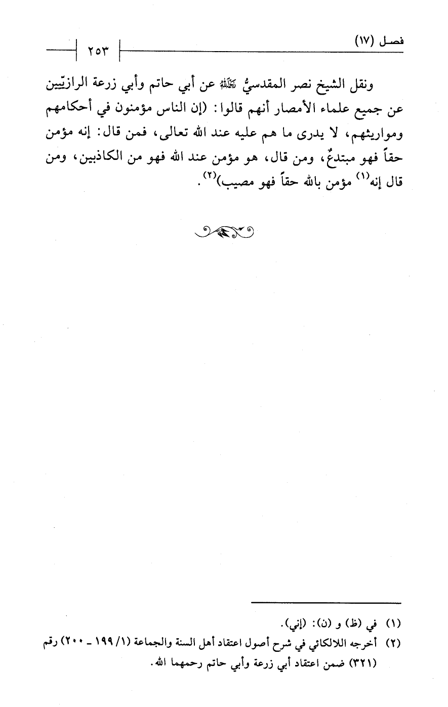 (¬2) أخرجه اللالكائي في شرح أصول اعتقاد أهل السنة والجماعة (1/ 199 - 200) رقم (321) ضمن اعتقاد أبي زرعة وأبي حاتم رحمهما الله.