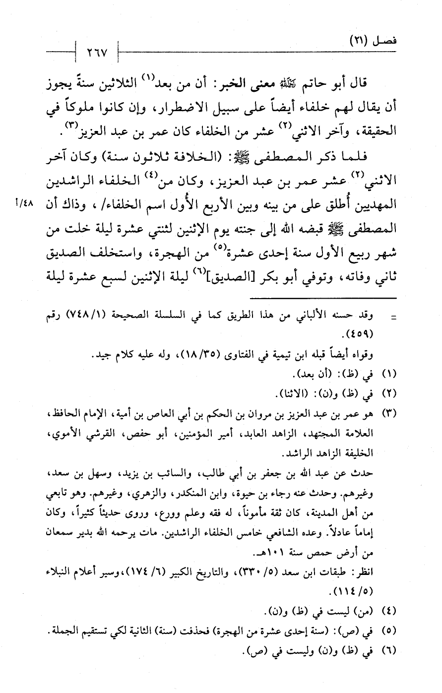 قال أبو حاتم - رحمه الله - معنى الخبر: أن من بعد (¬1) الثلاثين سنةً يجوز أن يقال لهم خلفاء أيضاً على سبيل الاضطرار، وإن كانوا ملوكاً في الحقيقة، وآخر الاثني (¬2) عشر من الخلفاء كان عمر بن عبد العزيز (¬3).