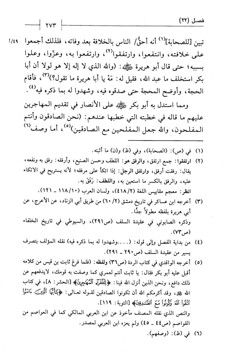 ومما استدل به أبو بكر - رضي الله عنه - على الأنصار في تقديم المهاجرين عليهم ما قاله في خطبته التي خطبها عندهم: (نحن الصادقون وأنتم المفلحون، والله جعل المفلحين مع الصادقين) (¬5)، أما وصف (¬6)