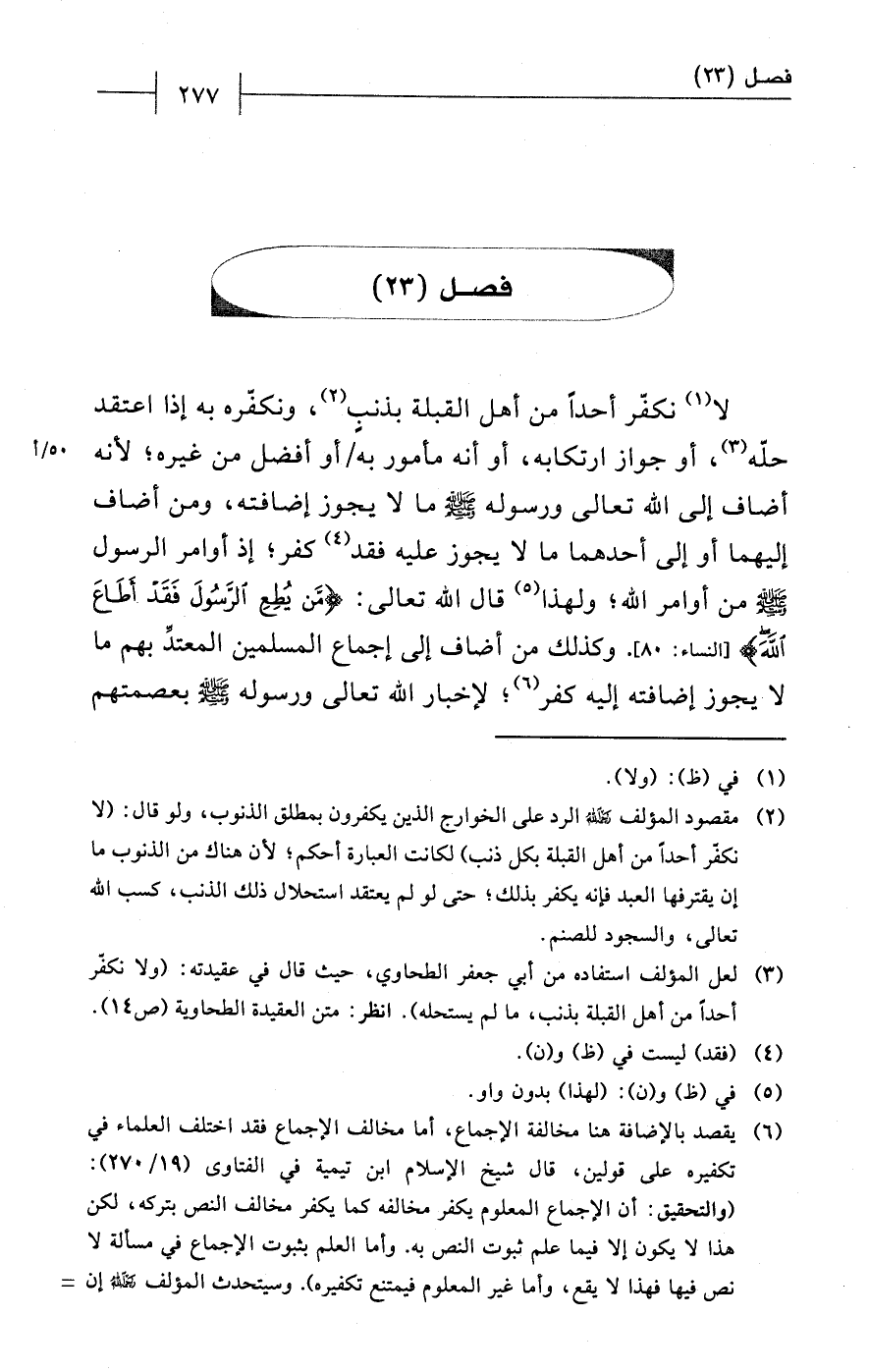(¬3) لعل المؤلف استفاده من أبي جعفر الطحاوي، حيث قال في عقيدته: (ولا نكفّر أحداً من أهل القبلة بذنب، ما لم يستحله). انظر: متن العقيدة الطحاوية (ص 14).