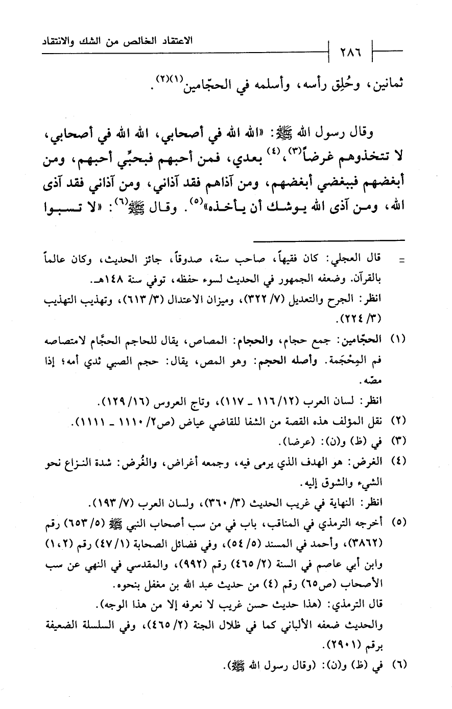 (¬5) أخرجه الترمذي في المناقب، باب في من سب أصحاب النبي - صلى الله عليه وسلم - (5/ 653) رقم (3862)، وأحمد في المسند (5/ 54)، وفي فضائل الصحابة (1/ 47) رقم (2، 1) وابن أبي عاصم في السنة (2/ 465) رقم (992)، والمقدسي في النهي عن سب الأصحاب (ص 65) رقم (4) من حديث عبد الله بن مغفل بنحوه.