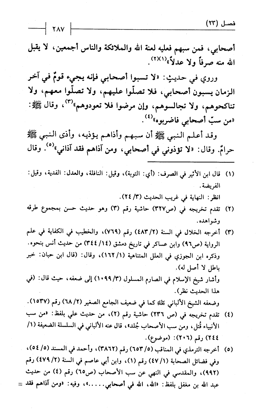 (¬4) تقدم تخريجه في (ص 236) حاشية رقم (2)، من حديث علي بلفظ: "من سب الأنبياء قُتل، ومن سب الأصحاب جُلد"، قال عنه الألباني في السلسلة الضعيفة (1/ 244) رقم (206): (موضوع).