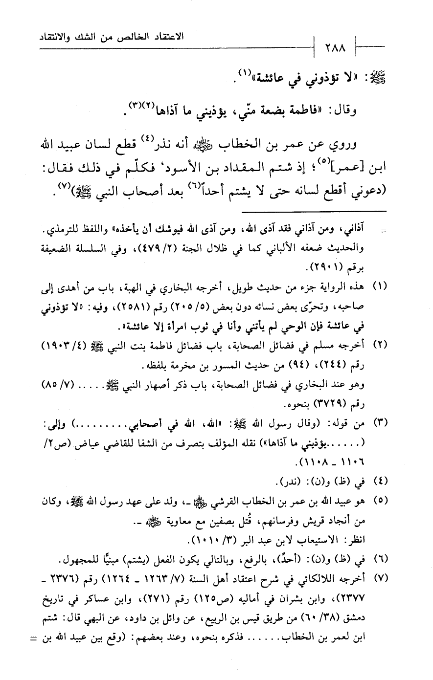 (¬3) من قوله: (وقال رسول الله - صلى الله عليه وسلم -: "الله، الله في أصحابي .........) وإلى: (...... يؤذيني ما آذاها") نقله المؤلف بتصرف من الشفا للقاضي عياض (ص 2/ 1106 - 1108).