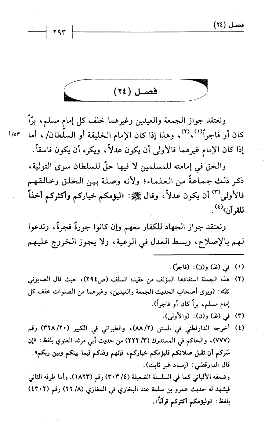 (¬2) هذه الجملة استفادها المؤلف من عقيدة السلف (ص 294)، حيث قال الصابوني - رحمه الله -: (ويرى أصحاب الحديث الجمعة والعيدين، وغيرهما من الصلوات خلف كل إمام مسلم، براً كان أو فاجراً).