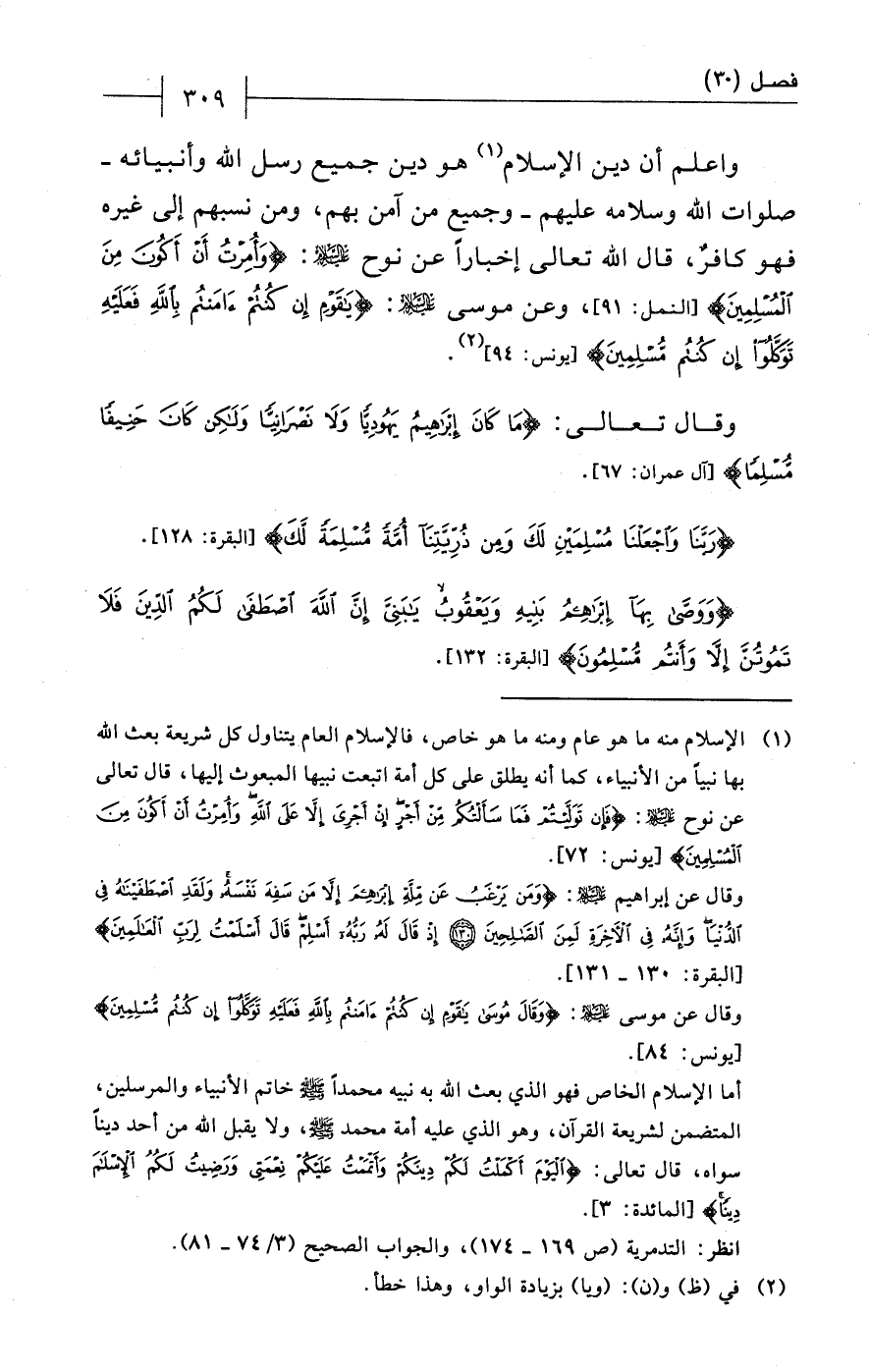 (¬1) الإسلام منه ما هو عام ومنه ما هو خاص، فالإسلام العام يتناول كل شريعة بعث الله بها نبياً من الأنبياء، كما أنه يطلق على كل أمة اتبعت نبيها المبعوث إليها، قال تعالى عن نوح - عليه السلام -: {فَإِنْ تَوَلَّيْتُمْ فَمَا سَأَلْتُكُمْ مِنْ أَجْرٍ إِنْ أَجْرِيَ إلا عَلَى اللَّهِ وَأُمِرْتُ أَنْ أَكُونَ مِنَ الْمُسْلِمِينَ} [يونس: 72].
