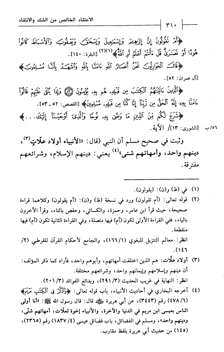 (¬4) أخرجه البخاري في أحاديث الأنبياء، باب قوله تعالى: {وَاذْكُرْ فِي الْكِتَابِ مَرْيَمَ} (6/ 478) رقم (3443)، عن أبي هريرة - رضي الله عنه - قال: قال رسول الله - صلى الله عليه وسلم -: "أنا أولى الناس بعيسى ابن مريم في الدنيا والآخرة، والأنبياه إخوة لعلَّات، أمهاتهم شتّى، ودينهم واحد"، ومسلم في الفضائل، باب فضائل عيسى (4/ 1837) رقم (2365)، (145) من حديث أبي هريرة بلفظ مقارب.