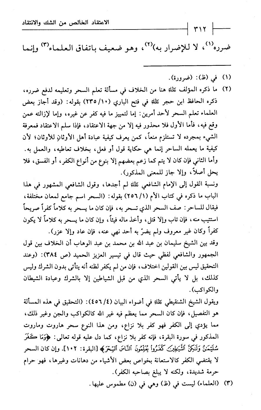 (¬2) ما ذكره المؤلف - رحمه الله - هنا من الخلاف في مسألة تعلم السحر وتعليمه لدفع ضرره، ذكره الحافظ ابن حجر - رحمه الله - في فتح الباري (10/ 235) بقوله: (وقد أجاز بعض العلماء تعلم السحر لأحد أمرين: إما لتمييز ما فيه كفر عن غيره، وإما لإزالته عمن وقع فيه، فأما الأول فلا محذور فيه إلا من جهة الاعتقاد، فإذا سلم الاعتقاد فمعرفة الشيء بمجرده لا تستلزم منعاً، كمن يعرف كيفية عبادة أهل الأوثانِ للأوثان؛ لأن كيفية ما يعمله الساحر إنما هي حكاية قول أو فعل، بخلاف تعاطيه، والعمل به. وأما الثاني فإن كان لا يتم كما زعم بعضهم إلا بنوع من أنواع الكفر، أو الفسق، فلا يحل أصلاً، وإلا جاز للمعنى المذكور).