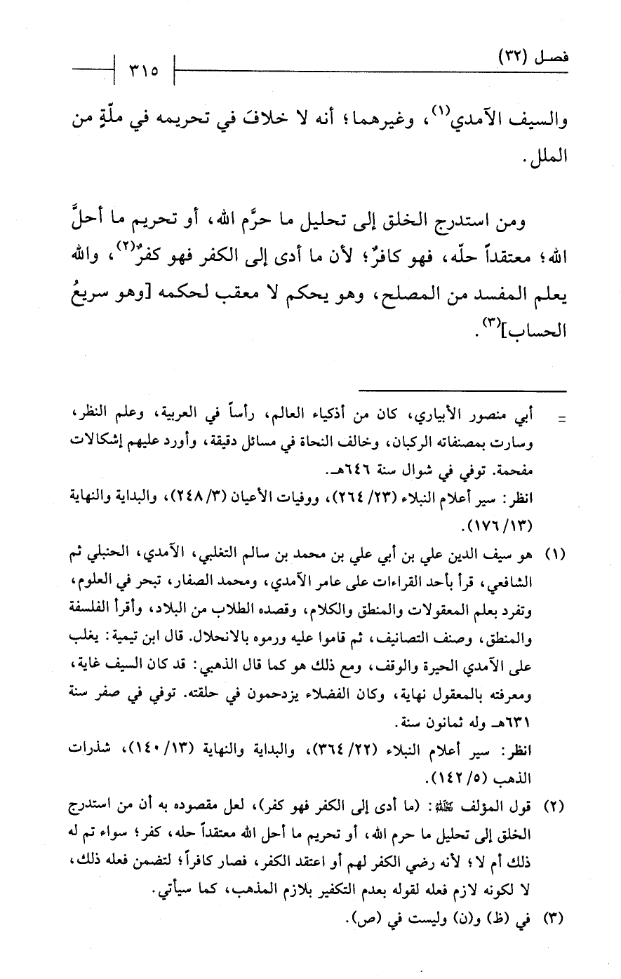 (¬1) هو سيف الدين علي بن أبي علي بن محمد بن سالم التغلبي، الآمدي، الحنبلي ثم الشافعي، قرأ بأحد القراءات على عامر الآمدي، ومحمد الصفار، تبحر في العلوم، وتفرد بعلم المعقولات والمنطق والكلام، وقصده الطلاب من البلاد، وأقرأ الفلسفة والمنطق، وصنف التصانيف، ثم قاموا عليه ورموه بالانحلال. قال ابن تيمية: يغلب على الآمدي الحيرة والوقف، ومع ذلك هو كما قال الذهبي: قد كان السيف غاية، ومعرفته بالمعقول نهاية، وكان الفضلاء يزدحمون في حلقته، توفي في صفر سنة 631 هـ وله ثمانون سنة.