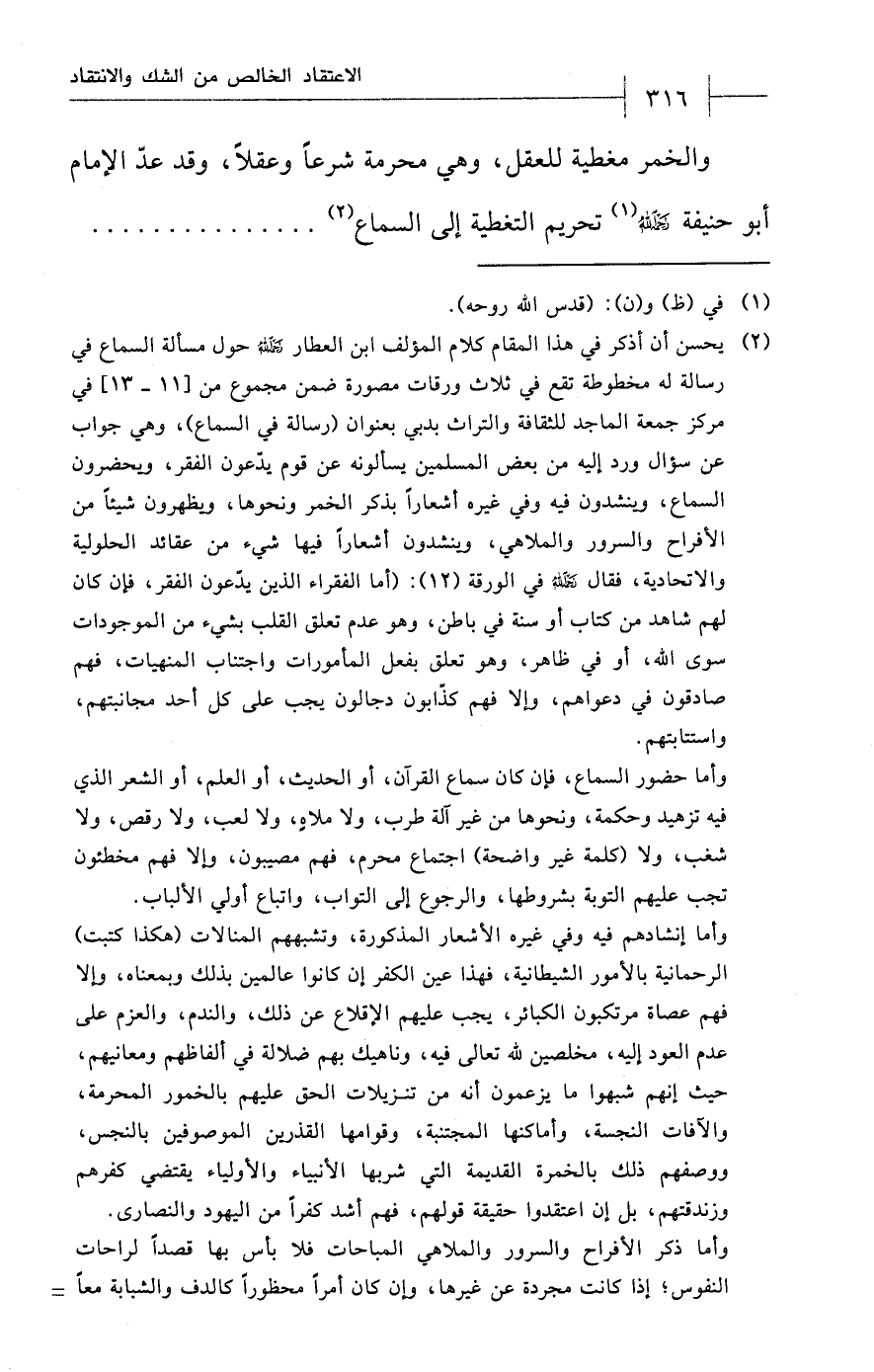وأما إنشادهم فيه وفي غيره الأشعار المذكورة، وتشبههم المنالات (هكذا كتبت) الرحمانية بالأمور الشيطانية، فهذا عين الكفر إن كانوا عالمين بذلك وبمعناه، وإلا فهم عصاة مرتكبون الكبائر، يجب عليهم الإقلاع عن ذلك، والندم، والعزم على عدم العود إليه، مخلصين لله تعالى فيه، وناهيك بهم ضلالة في ألفاظهم ومعانيهم، حيث إنهم شبهوا ما يزعمون أنه من تنزيلات الحق عليهم بالخمور المحرمة، والآفات النجسة، وأماكنها المجتنبة، وقوامها القذرين الموصوفين بالنجس، ووصفهم ذلك بالخمرة القديمة التي شربها الأنبياء والأولياء يقتضي كفرهم وزندقتهم، بل إن اعتقدوا حقيقة قولهم، فهم أشد كفراً من اليهود والنصارى.