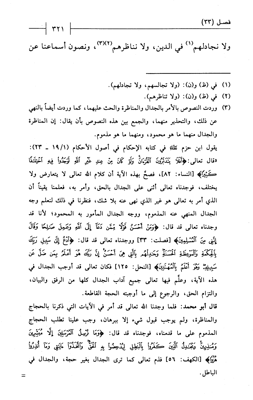 يقول ابن حزم - رحمه الله - في كتابه الإحكام في أصول الأحكام (1/ 19 - 23): "قال تعالى: {أَفَلَا يَتَدَبَّرُونَ الْقُرْآنَ وَلَوْ كَانَ مِنْ عِنْدِ غَيْرِ اللَّهِ لَوَجَدُوا فِيهِ اخْتِلَافًا كَثِيرًا} [النساء: 82]، فصحَّ بهذه الآية أن كلام الله تعالى لا يتعارض ولا يختلف، فوجدناه تعالى أثنى على الجدال بالحق، وأمر به، فعلمنا يقيناً أن الذي أمر به تعالى هو غير الذي نهى عنه بلا شك، فنظرنا في ذلك لنعلم وجه الجدال المنهي عنه المذموم، ووجه الجدال المأمور به المحمود؛ لأنا قد وجدناه تعالى قد قال: {وَمَنْ أَحْسَنُ قَوْلًا مِمَّنْ دَعَا إِلَى اللَّهِ وَعَمِلَ صَالِحًا وَقَالَ إِنَّنِي مِنَ الْمُسْلِمِينَ} [فصلت: 33] ووجدناه تعالى قد قال: {ادْعُ إِلَى سَبِيلِ رَبِّكَ بِالْحِكْمَةِ وَالْمَوْعِظَةِ الْحَسَنَةِ وَجَادِلْهُمْ بِالَّتِي هِيَ أَحْسَنُ إِنَّ رَبَّكَ هُوَ أَعْلَمُ بِمَنْ ضَلَّ عَنْ سَبِيلِهِ وَهُوَ أَعْلَمُ بِالْمُهْتَدِينَ} [النحل: 125] فكان تعالى قد أوجب الجدال في هذه الآية، وعلَّم فيها تعالى جميع آداب الجدال كلها من الرفق والبيان، والتزام الحق، والرجوع إلى ما أوجبته الحجة القاطعة.