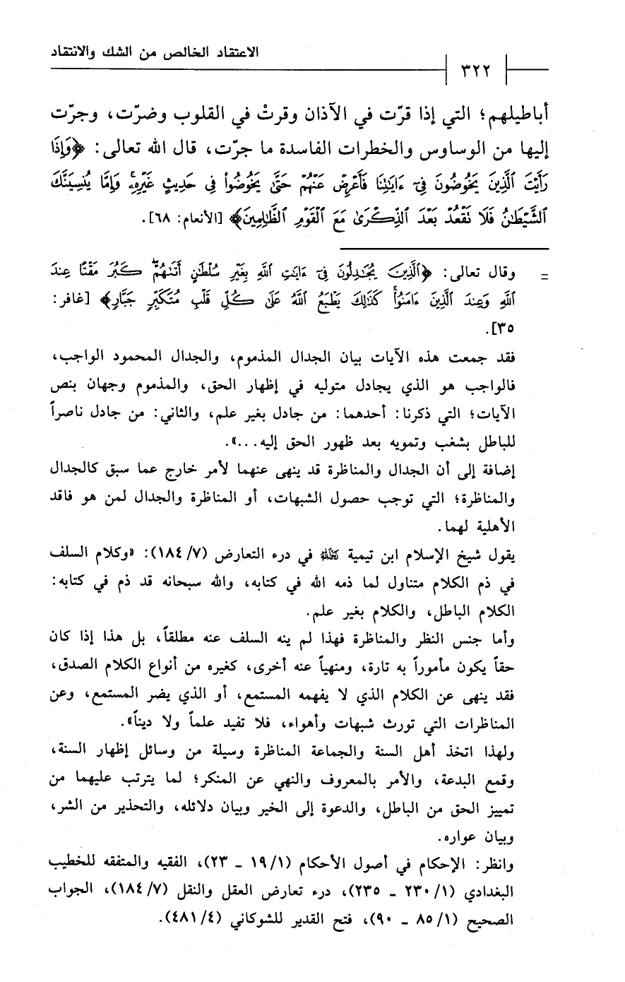فقد جمعت هذه الآيات بيان الجدال المذموم، والجدال المحمود الواجب، فالواجب هو الذي يجادل متوليه فى إظهار الحق، والمذموم وجهان بنص الآيات؛ التي ذكرنا: أحدهما: من جادل بغير علم، والثاني: من جادل ناصراً للباطل بشغب وتمويه بعد ظهور الحق إليه ... ".