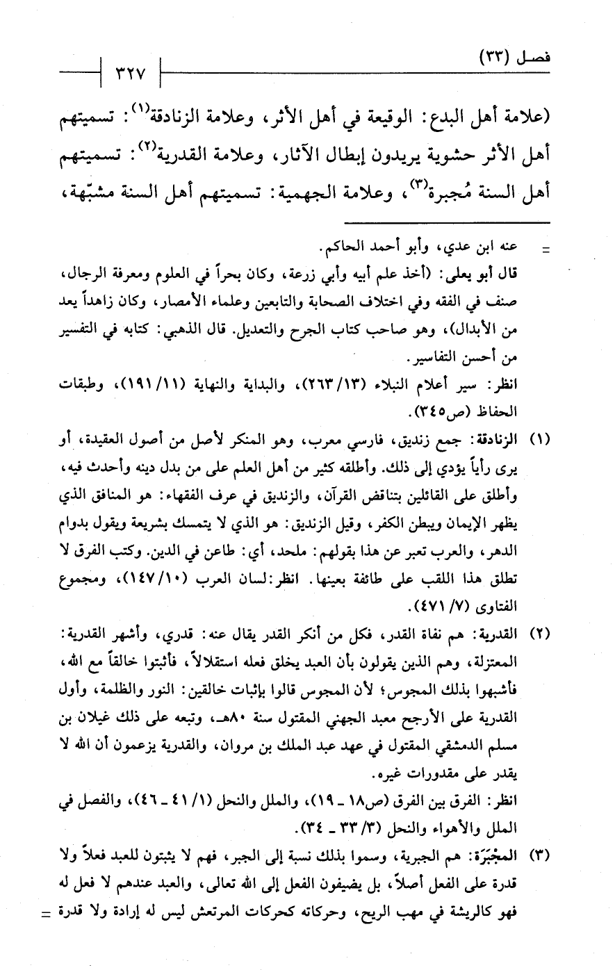 (علامة أهل البدع: الوقيعة قي أهل الأثر، وعلامة الزنادقة (¬1): تسميتهم أهل الأثر حشوية يريدون إبطال الآثار، وعلامة القدرية (¬2): تسميتهم أهل السنة مُجبرة (¬3)، وعلامة الجهمية: تسميتهم أهل السنة مشبّهة،