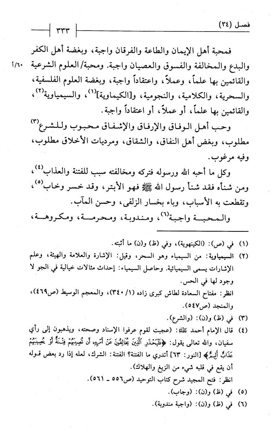 فمحبة أهل الإيمان والطاعة والفرقان واجبة، وبغضة أهل الكفر والبدع والمخالفة والفسوق والعصيان واجبة. ومحبة العلوم الشرعية والقائمين بها علماً، وعملًا، واعتقاداً واجبة، وبغضة العلوم الفلسفية، والسحرية، والكلامية، والنجومية، و [الكيماوية] (¬1)، والسيمياوية (¬2)، والقائمين بها علماً، أو عملًا، أو اعتقاداً واجبة.