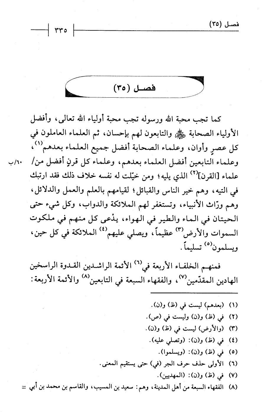 كما تجب محبة الله ورسوله تجب محبة أولياء الله تعالى، وأفضل الأولياء الصحابة - رضي الله عنهم - والتابعون لهم بإحسان، ثم العلماء العاملون في كل عصرٍ وأوان، وعلماء الصحابة أفضل جميع العلماء بعدهم (¬1)، وعلماء التابعين أفضل العلماء بعدهم، وعلماء كل قرنٍ أفضل من علماء [القرن] (¬2) الذي يليه؛ ومن خيّلت له نفسه خلاف ذلك فقد ارتبك في التيه، وهم خير الناس والقبائل؛ لقيامهم بالعلم والعمل والدلائل، وهم ورّاث الأنبياء، وتستغفر لهم الملائكة والدواب، وكل شيء حتى الحيتان في الماء والطير في الهواء، يدْعى كل منهم في ملكوت السموات والأرض (¬3) عظيماً، ويصلي عليهم (¬4) الملائكة في كل حين، ويسلمون (¬5) تسليماً.