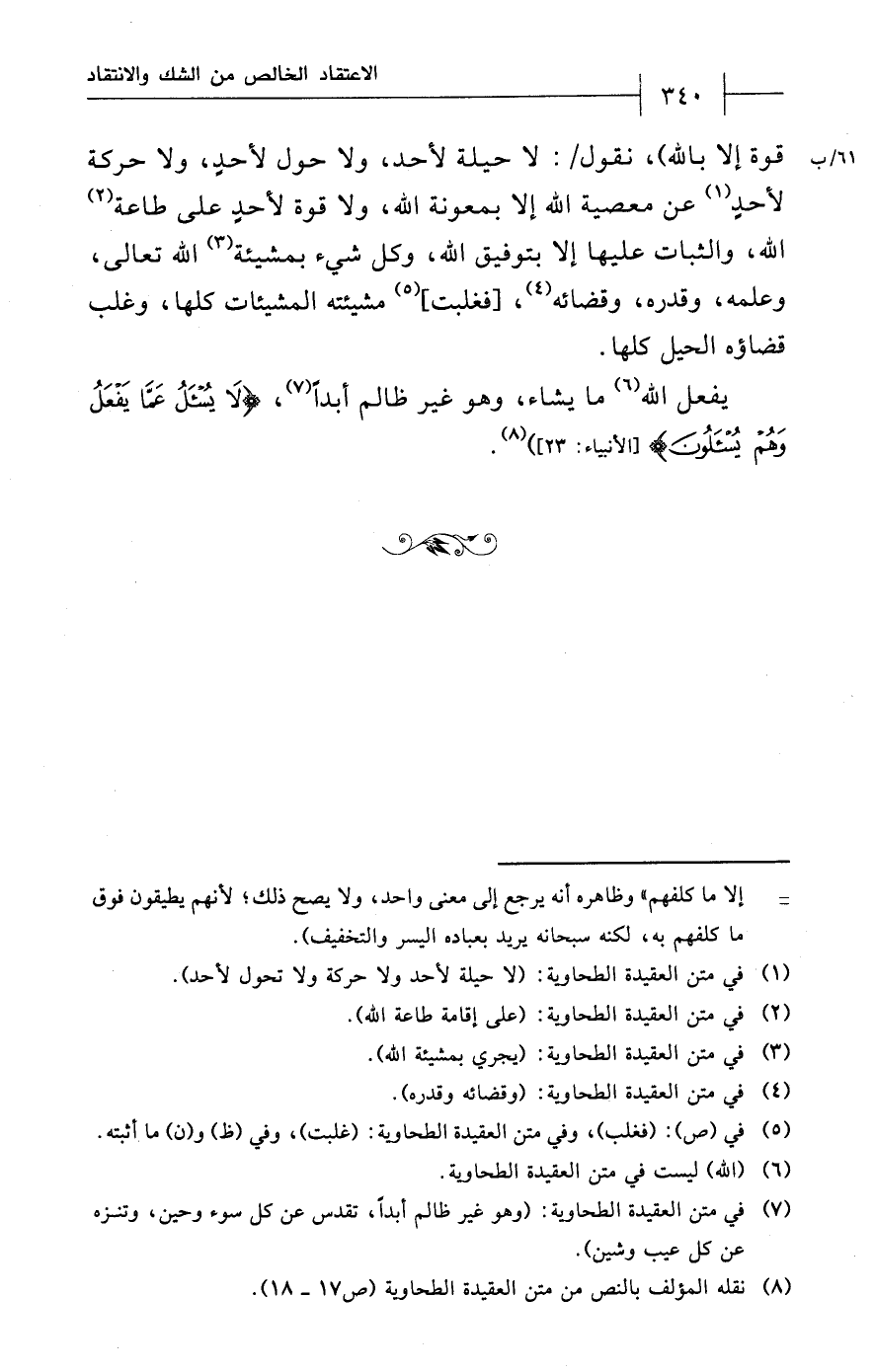 (¬1) في متن العقيدة الطحاوية: (لا حيلة لأحد ولا حركة ولا تحول لأحد).