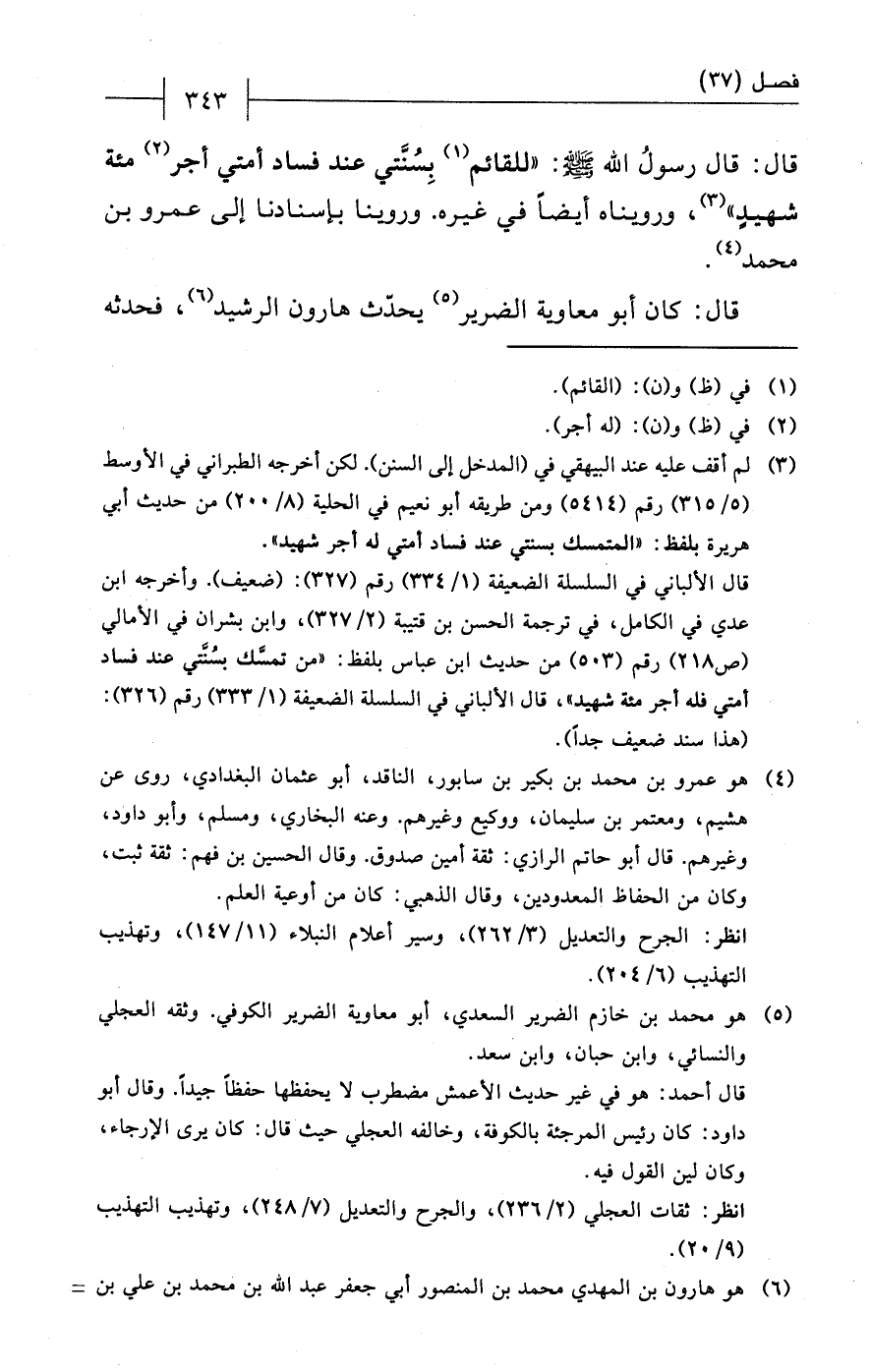قال: قال رسولُ الله - صلى الله عليه وسلم -: "للقائم (¬1) بِسُنَّتي عند فساد أمتي أجر (¬2) مئة شهيدٍ" (¬3)، ورويناه أيضاً في غيره. وروينا بإسنادنا إلى عمرو بن محمد (¬4).