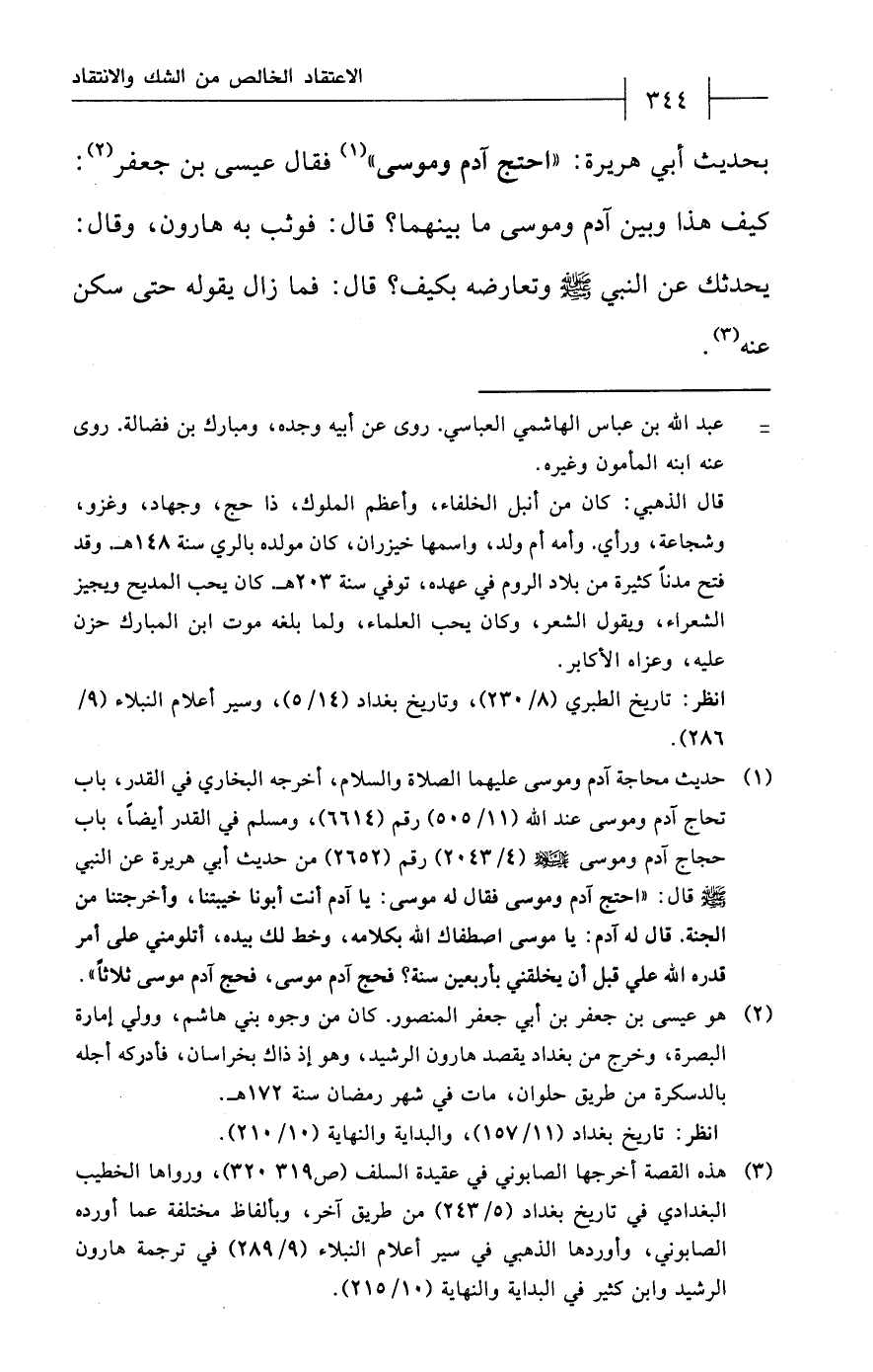 (¬3) هذه القصة أخرجها الصابوني في عقيدة السلف (ص 319 - 320)، ورواها الخطيب البغدادي في تاريخ بغداد (5/ 243) من طريق آخر، وبألفاظ مختلفة عما أورده الصابوني، وأوردها الذهبي في سير أعلام النبلاء (9/ 289) في ترجمة هارون الرشيد وابن كثير في البداية والنهاية (10/ 215).