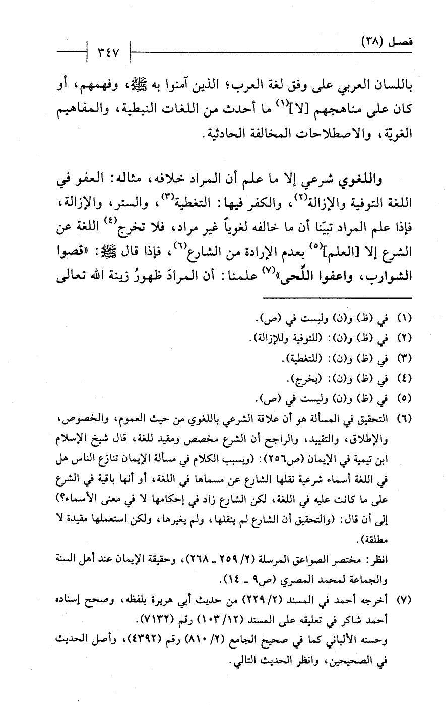 (¬6) التحقيق في المسألة هو أن علاقة الشرعي باللغوي من حيث العموم، والخصوص، والإطلاق، والتقييد، والراجح أن الشرع مخصص ومقيد للغة، قال شيخ الإسلام ابن تيمية في الإيمان (ص 256): (وبسبب الكلام في مسألة الإيمان تنازع الناس هل في اللغة أسماء شرعية نقلها الشارع عن مسماها في اللغة، أو أنها باقية في الشرع على ما كانت عليه في اللغة، لكن الشارع زاد في إحكامها لا في معنى الأسماء؟) إلى أن قال: (والتحقيق أن الشارع لم ينقلها، ولم يغيرها، ولكن استعملها مقيدة لا مطلقة).