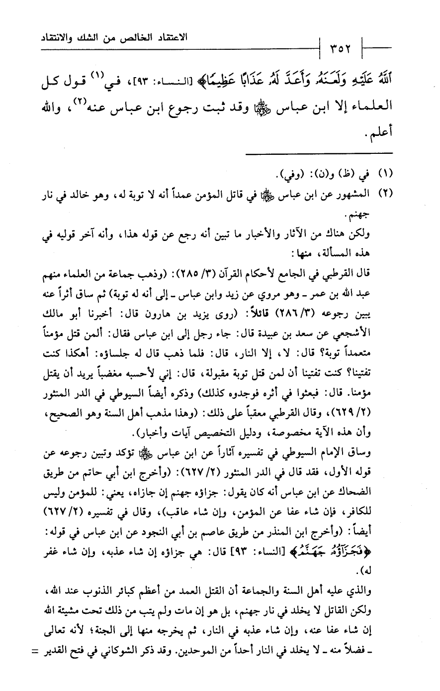 (¬2) المشهور عن ابن عباس - رضي الله عنهما - في قاتل المؤمن عمداً أنه لا توبة له، وهو خالد في نار جهنم.