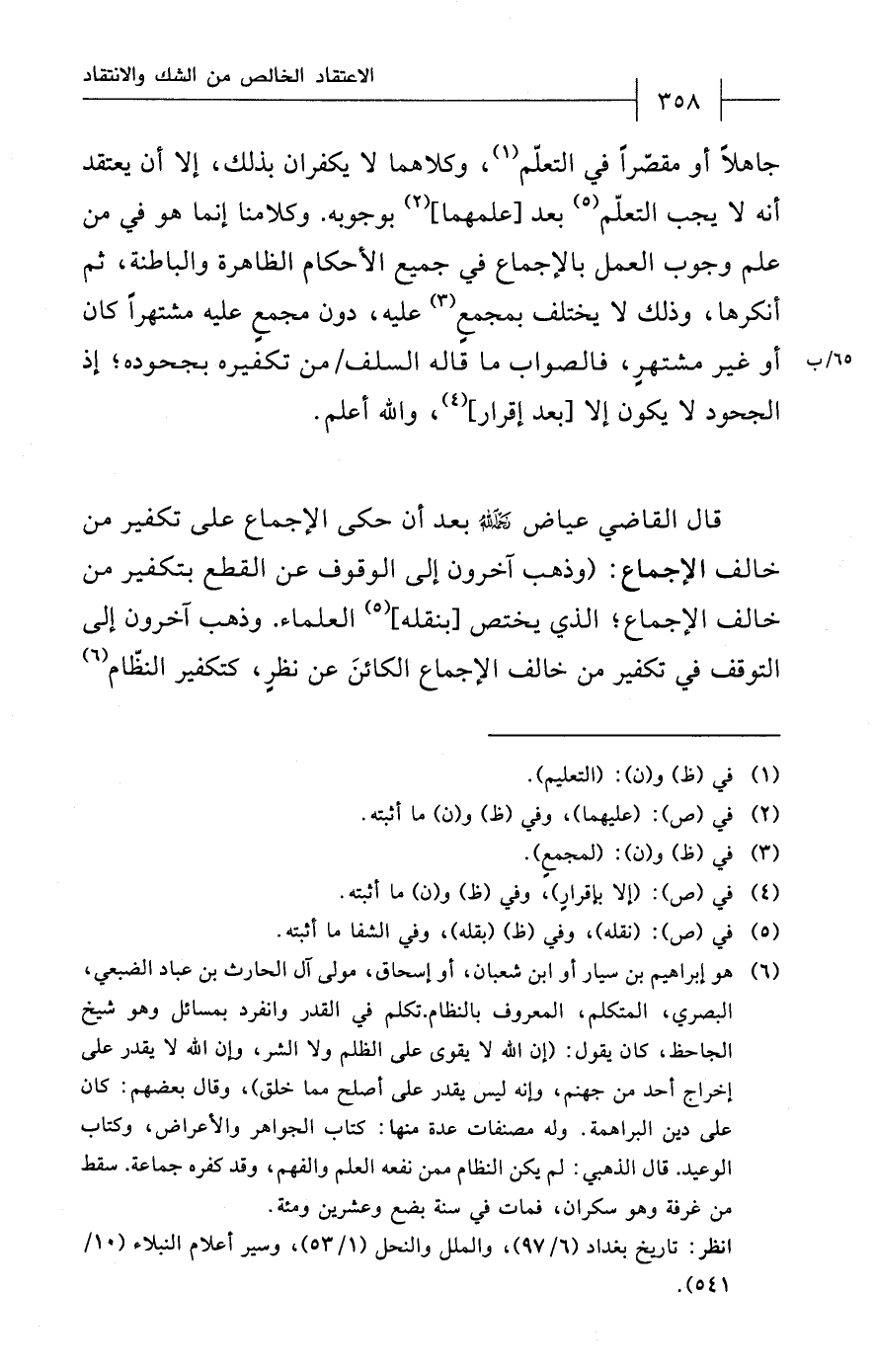 (¬6) هو إبراهيم بن سيار أو ابن شعبان، أو إسحاق، مولى آل الحارث بن عباد الضبعي، البصري، المتكلم، المعروف بالنظام. تكلم في القدر وانفرد بمسائل وهو شيخ الجاحظ، كان يقول: (إن الله لا يقوى على الظلم ولا الشر، وإن الله لا يقدر على إخراج أحد من جهنم، وإنه ليس يقدر على أصلح مما خلق)، وقال بعضهم: كان على دين البراهمة. وله مصنفات عدة منها: كتاب الجواهر والأعراض، وكتاب الوعيد. قال الذهبي: لم يكن النظام ممن نفعه العلم والفهم، وقد كفره جماعة. سقط من غرفة وهو سكران، فمات في سنة بضع وعشرين ومئة.