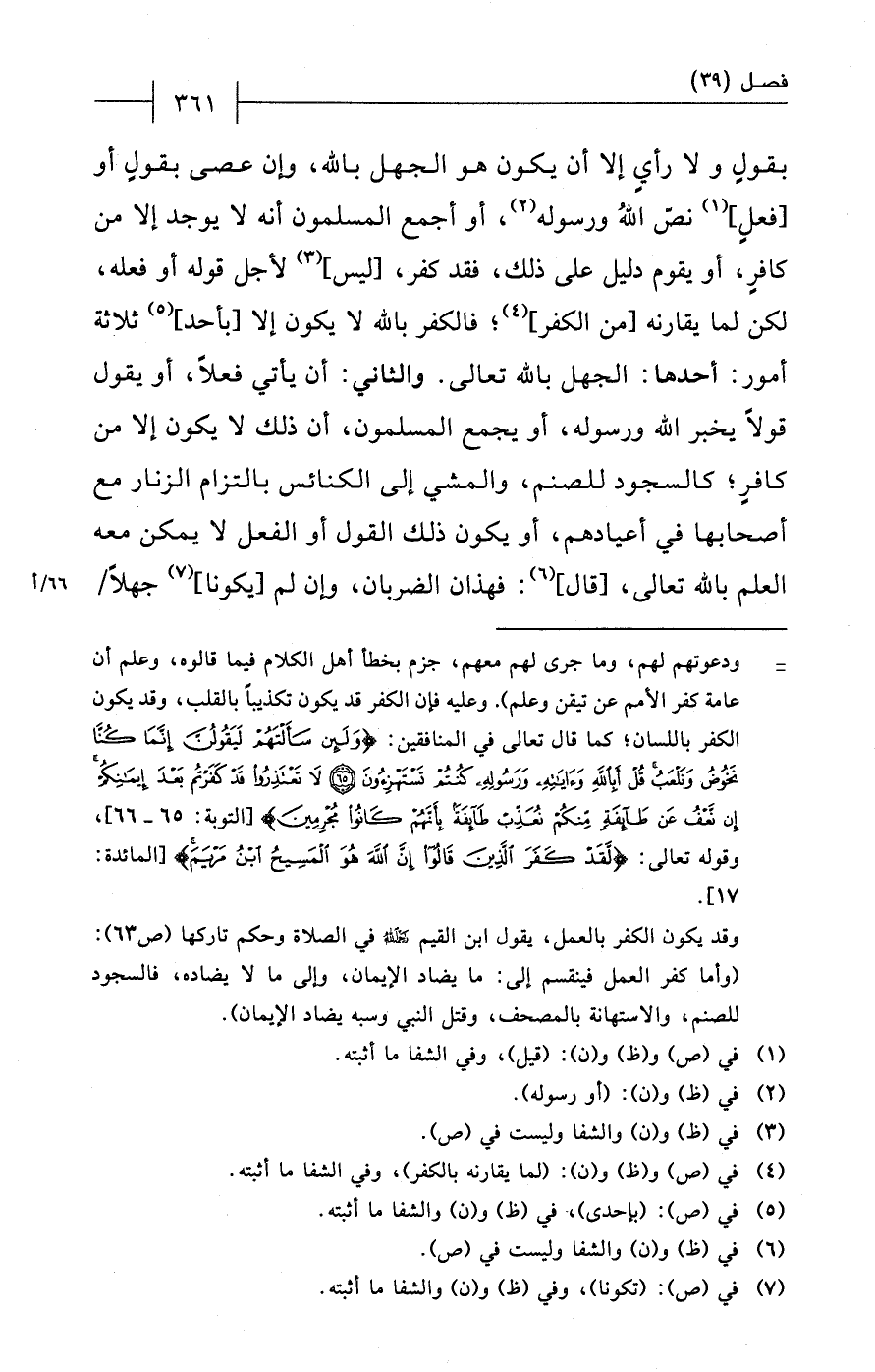 = ودعوتهم لهم، وما جرى لهم معهم، جزم بخطأ أهل الكلام فيما قالوه، وعلم أن عامة كفر الأمم عن تيقن وعلم). وعليه فإن الكفر قد يكون تكذيباً بالقلب، وقد يكون الكفر باللسان؛ كما قال تعالى في المنافقين: {وَلَئِنْ سَأَلْتَهُمْ لَيَقُولُنَّ إِنَّمَا كُنَّا نَخُوضُ وَنَلْعَبُ قُلْ أَبِاللَّهِ وَآيَاتِهِ وَرَسُولِهِ كُنْتُمْ تَسْتَهْزِئُونَ (65) لَا تَعْتَذِرُوا قَدْ كَفَرْتُمْ بَعْدَ إِيمَانِكُمْ إِنْ نَعْفُ عَنْ طَائِفَةٍ مِنْكُمْ نُعَذِّبْ طَائِفَةً بِأَنَّهُمْ كَانُوا مُجْرِمِينَ} [التوبة: 65 - 66]، وقوله تعالى: {لَقَدْ كَفَرَ الَّذِينَ قَالُوا إِنَّ اللَّهَ هُوَ الْمَسِيحُ ابْنُ مَرْيَمَ} [المائدة: 17].