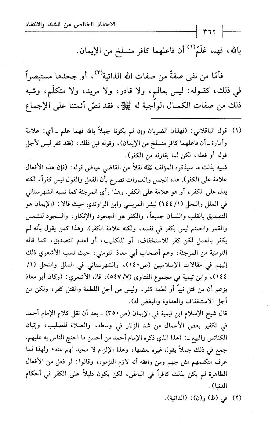 (¬1) قول الباقلاني: (فهذان الضربان وان لم يكونا جهلاً بالله فهما علم - أي: علامة وأمارة - أن فاعلهما كافر منسلخ من الإيمان)، وقوله قبل ذلك: (فقد كفر ليس لأجل قوله أو فعله، لكن لما يقارنه من الكفر).