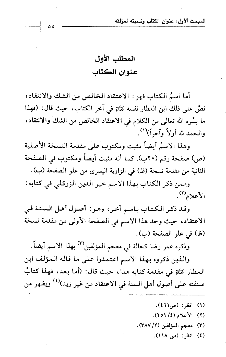 والذين ذكروه بهذا الاسم اعتمدوا على ما قاله المؤلف ابن العطار - رحمه الله - في مقدمة كتابه هذا، حيث قال: (أما بعد، فهذا كتابٌ صنفته على أصول أهل السنة في الاعتقاد من غير زيد) (¬4) ويظهر من
