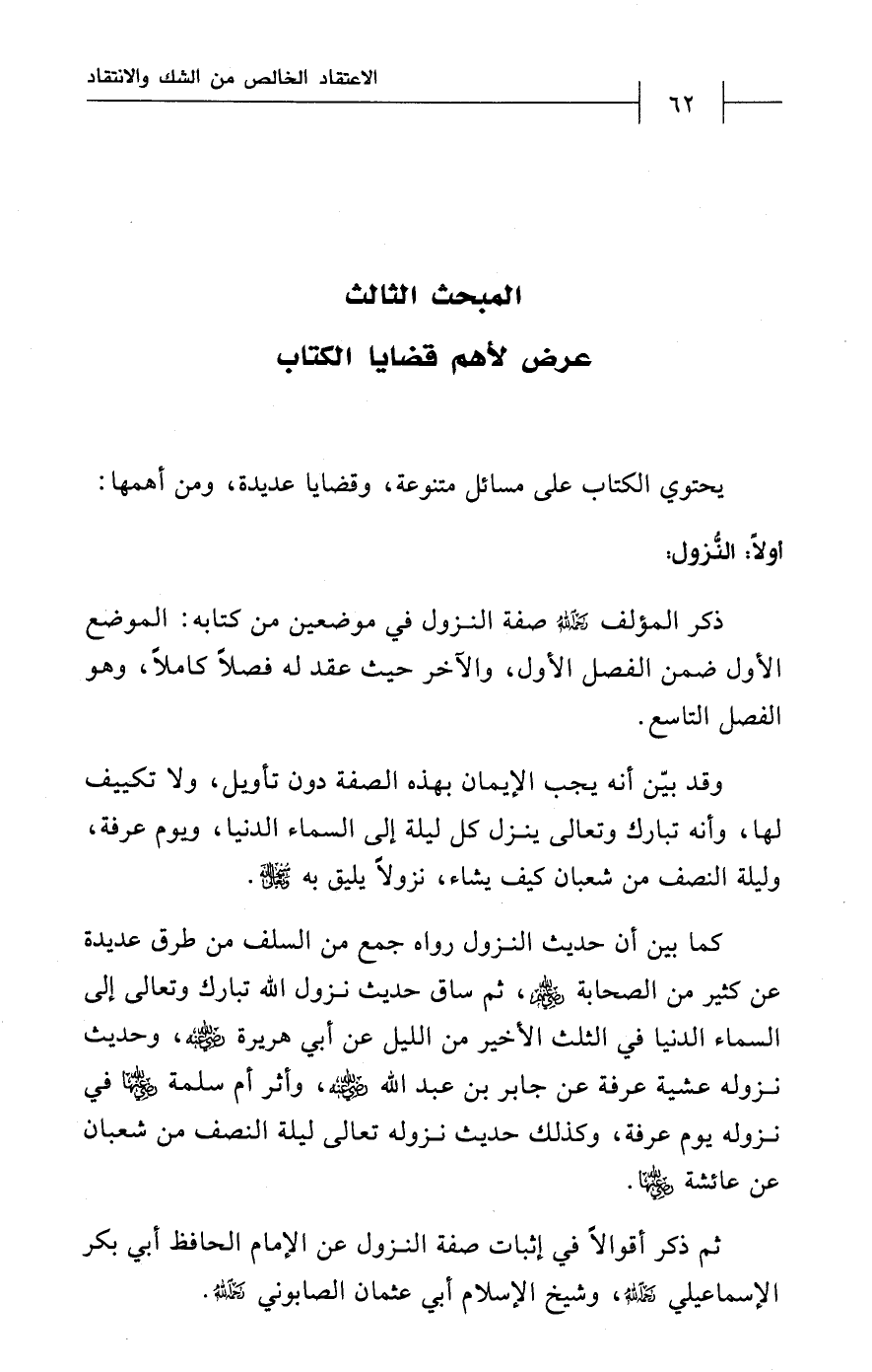 وقد بيّن أنه يجب الإيمان بهذه الصفة دون تأويل، ولا تكييف لها، وأنه تبارك وتعالى ينزل كل ليلة إلى السماء الدنيا، ويوم عرفة، وليلة النصف من شعبان كيف يشاء، نزولاً يليق به - سبحانه وتعالى -.