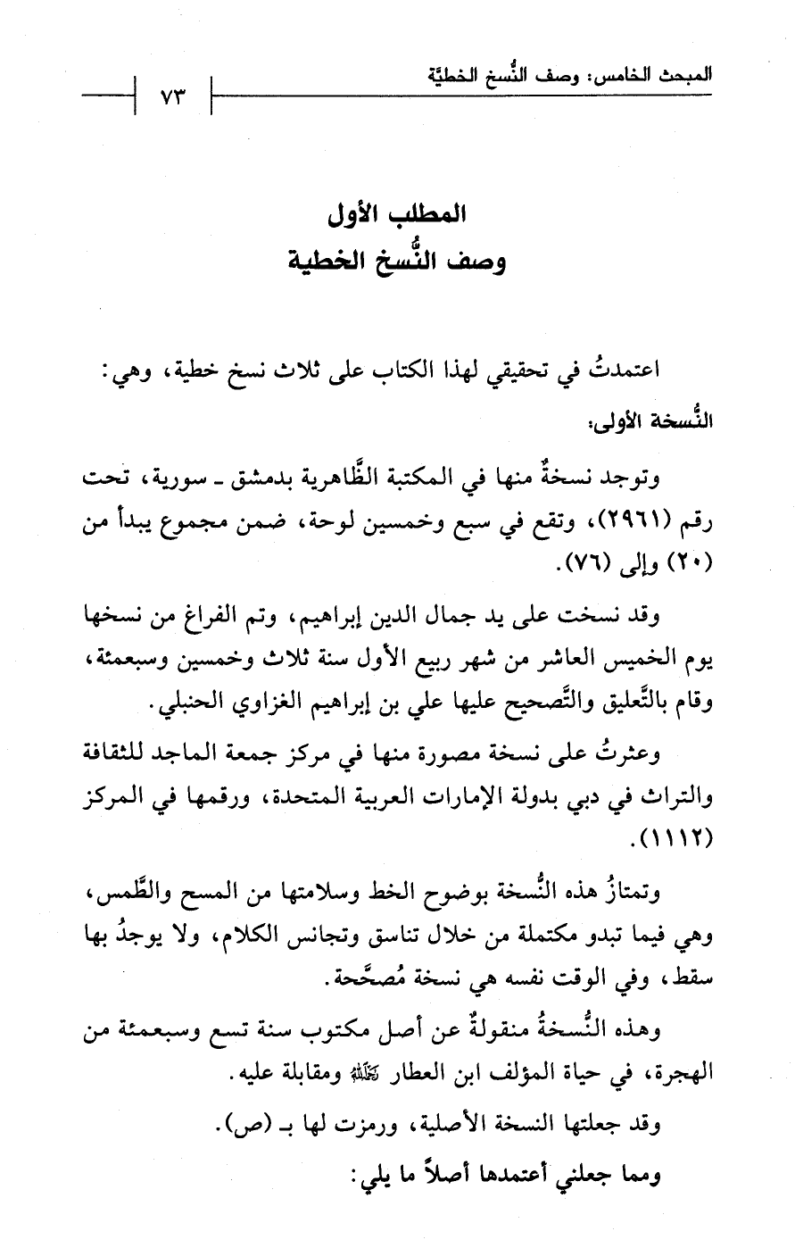 وتوجد نسخةٌ منها في المكتبة الظَّاهرية بدمشق - سورية، تحت رقم (2961)، وتقع في سبع وخمسين لوحة، ضمن مجموع يبدأ من (20) وإلى (76).