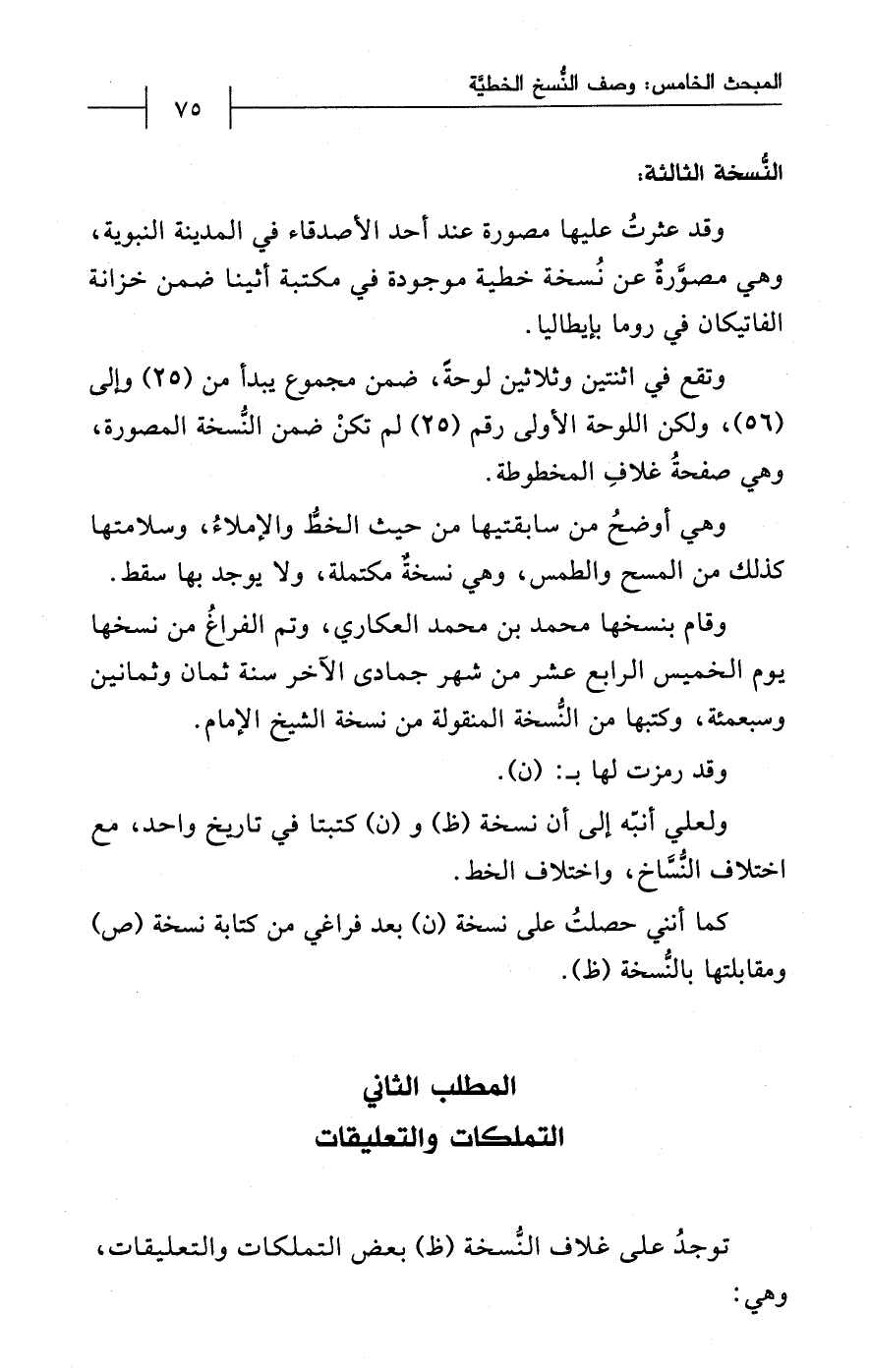 كما أنني حصلتُ على نسخة (ن) بعد فراغي من كتابة نسخة (ص) ومقابلتها بالنُّسخة (ظ).