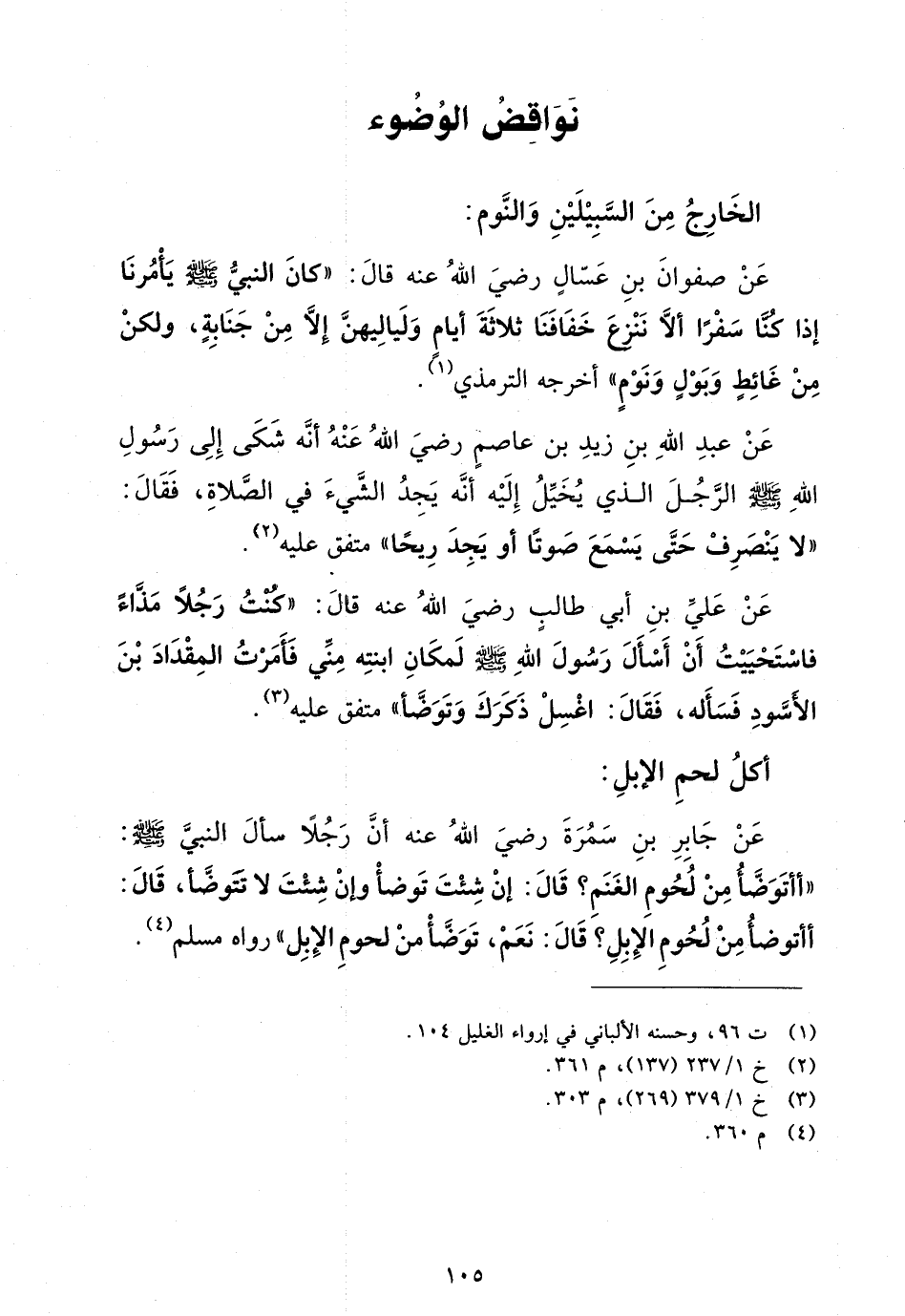عن جابر بن سمرة رضي الله عنه أن رجلاً سأل النبي صلى الله عليه وسلم: "أأتوضأ من لحوم الغنم؟ قال: إن شئت توضأ وإن شئت لا تتوضأ، قال: أأتوضأ من لحوم الإبل؟ قال: نعم، توضأ من لحوم الإبل" رواه مسلم (¬4).