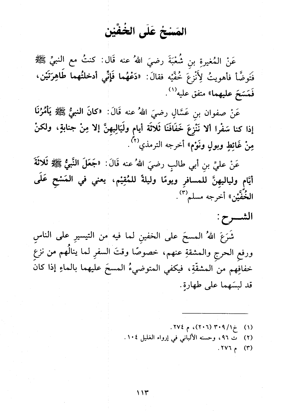 عن علي بن أبي طالب رضي الله عنه قال: "جعل النبي صلى الله عليه وسلم ثلاثة أيام ولياليهن للمسافر ويوماً وليلة للمقيم، يعني في المسح على الخفين" أخرجه مسلم (¬3).