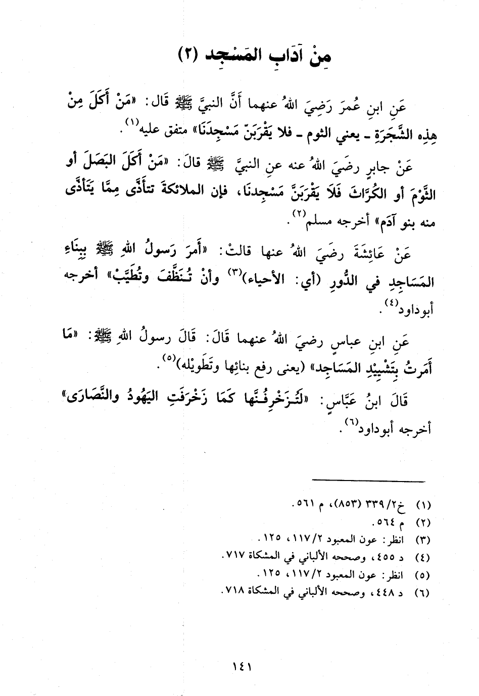 عن ابن عمر رضي الله عنهما أن النبي صلى الله عليه وسلم قال: "من أكل من هذه الشجرة - يعني الثوم - فلا يقربن مسجدنا" متفق عليه (¬1).