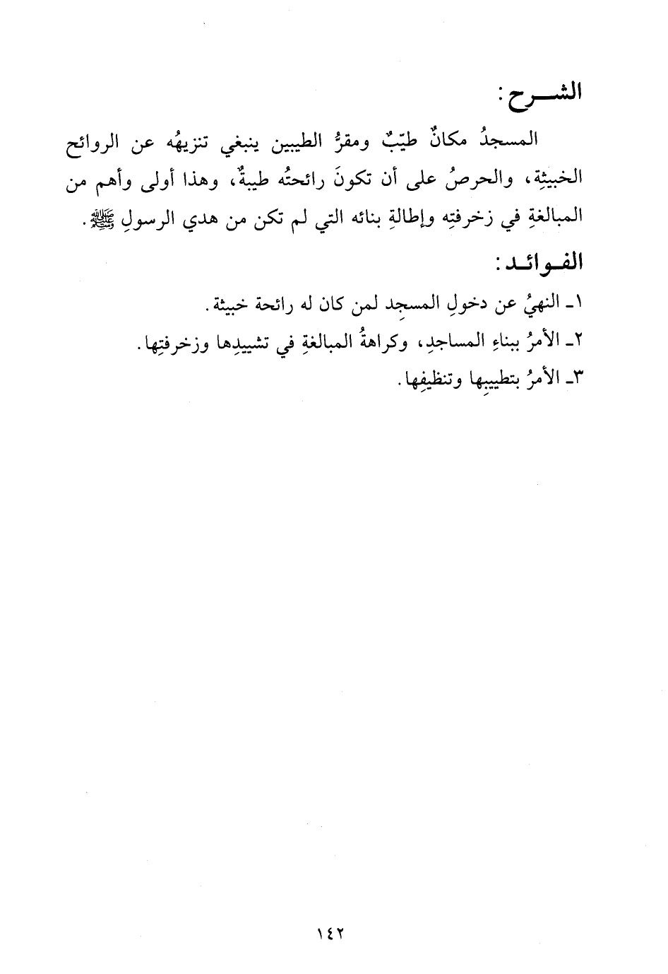 المسجد مكان طيب ومقر الطيبين ينبغي تنزيهه عن الروائح الخبيثة، والحرص على أن تكون رائحته طيبة، وهذا أولى وأهم من المبالغة في زخرفته وإطالة بنائه التي لم تكن من هدي الرسول صلى الله عليه وسلم.