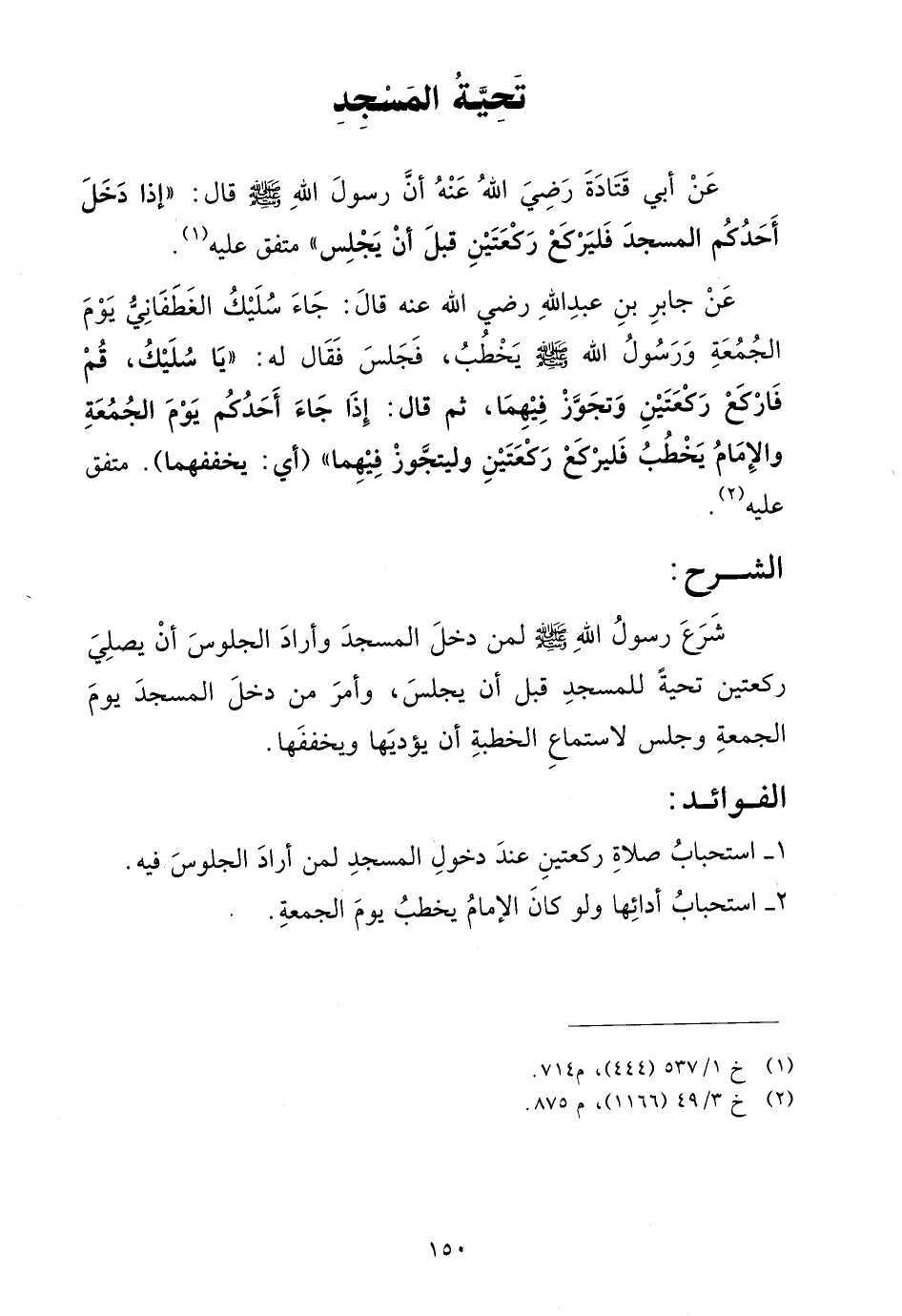 عن أبي قتادة رضي الله عنه أن رسول الله صلى الله عليه وسلم قال: "إذا دخل أحدكم المسجد فليركع ركعتين قبل أن يجلس" متفق عليه (¬1).