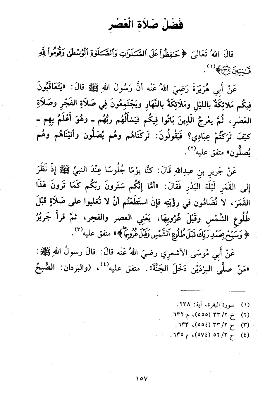 عن جرير بن عبد الله قال: كنا يوماً جلوساً عند النبي صلى الله عليه وسلم إذ نظر إلى القمر ليلة البدر فقال: "أما إنكم سترون ربكم كما ترون هذا القمر، لا تضامون في رؤيته فإن استطعتم أن لا تغلبوا على صلاة قبل طلوع الشمس وقبل غروبها، يعني العصر والفجر، ثم قرأ جرير {وَسَبِّحْ بِحَمْدِ رَبِّكَ قَبْلَ طُلُوعِ الشَّمْسِ وَقَبْلَ غُرُوبِهَا} متفق عليه (¬3).