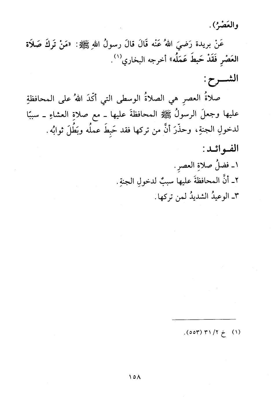 عن بريدة رضي الله عنه قال قال رسول الله صلى الله عليه وسلم: "من ترك صلاة العصر فقد حبط عمله" أخرجه البخاري (¬1).