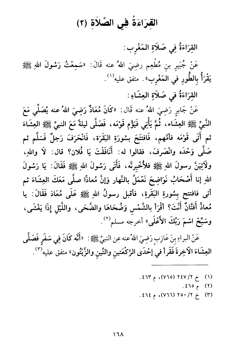 عن جابر رضي الله عنه قال: "كان معاذ رضي الله عنه يصلي مع النبي صلى الله عليه وسلم العشاء، ثم يأتي فيؤم قومه، فصلى ليلة مع النبي صلى الله عليه وسلم العشاء ثم أتى قومه فأمهم، فافتتح بسورة البقرة، فانحرف رجل فسلم ثم صلى وحده وانصرف، فقالوا له: أنافقت يا فلان؟ قال: لا والله، ولآتين رسول الله صلى الله عليه وسلم فلأخبرنه، فأتى رسول الله صلى الله عليه وسلم فقال: يا رسول الله إنا أصحاب نواضح نعمل بالنهار وإن معاذا صلى معك العشاء ثم أتى فافتتح بسورة البقرة، فأقبل رسول الله صلى الله عليه وسلم على معاذ فقال: يا معاذ أفتان أنت؟ اقرأ بالشمس وضحاها والضحى، والليل إذا يغشى، وسبح اسم ربك الأعلى" أخرجه مسلم (¬2).