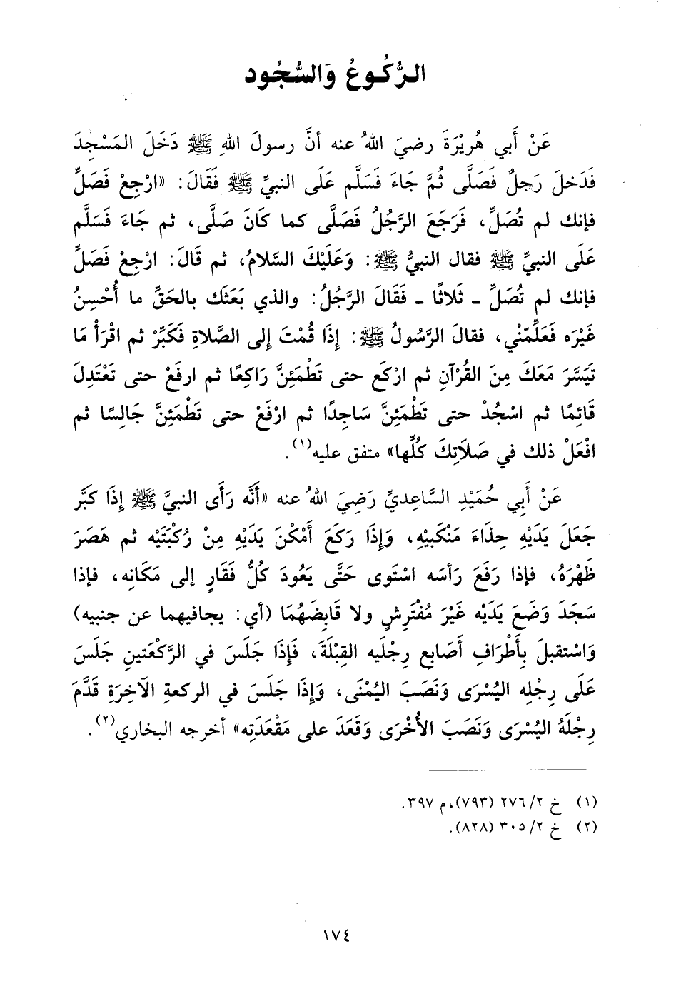 عن أبي هريرة رضي الله عنه أن رسول الله صلى الله عليه وسلم دخل المسجد فدخل رجل فصلى ثم جاء فسلم على النبي صلى الله عليه وسلم فقال: "ارجع فصل فإنك لم تصل، فرجع الرجل فصلى كما كان صلى، ثم جاء فسلم على النبي صلى الله عليه وسلم فقال النبي صلى الله عليه وسلم: وعليك السلام، ثم قال: ارجع فصل فإنك لم تصل - ثلاثا- فقال الرجل: والذي بعثك بالحق ما أحسن غيره فعلمني، فقال الرسول صلى الله عليه وسلم: إذا قمت إلى الصلاة فكبر ثم اقرأ ما تيسر معك من القرآن ثم اركع حتى تطمئن راكعاً ثم ارفع حتى تعتدل قائماً ثم اسجد حتى تطمئن ساجداً ثم ارفع حتى تطمئن جالساً ثم افعل ذلك في صلاتك كلها" (¬1).