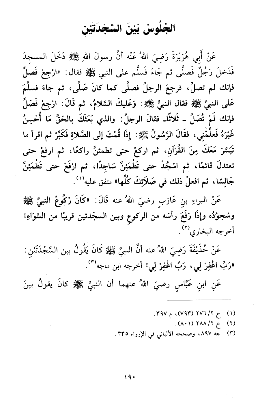 عن أبي هريرة رضي الله عنه أن رسول الله صلى الله عليه وسلم دخل المسجد فدخل رجل فصلى ثم جاء فسلم على النبي صلى الله عليه وسلم فقال: "ارجع فصل فإنك لم تصل، فرجع الرجل فصلى كما كان صلى، ثم جاء فسلم على النبي صلى الله عليه وسلم فقال النبي صلى الله عليه وسلم: وعليك السلام، ثم قال: ارجع فصل فإنك لم تصل - ثلاثاً - فقال الرجل: والذي بعثك بالحق ما أحسن غيره فعلمني، فقال الرسول صلى الله عليه وسلم: إذا قمت إلى الصلاة فكبر ثم اقرأ ما تيسر معك من القرآن، ثم اركع حتى تطمئن راكعاً، ثم ارفع حتى تعتدل قائماً، ثم اسجد حتى تطمئن ساجداً، ثم ارفع حتى تطمئن جالساً، ثم افعل ذلك في صلاتك كلها" متفق عليه (¬1).