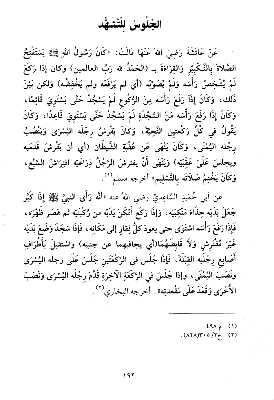 عن عائشة رضي الله عنها قالت: "كان رسول الله صلى الله عليه وسلم يستفتح الصلاة بالتكبير والقراءة بـ (الحمد لله رب العالمين) وكان إذا ركع لم يشخص رأسه ولم يصوبه (أي لم يرفعه ولم يخفضه) ولكن بين ذلك، وكان إذا رفع رأسه من الركوع لم يسجد حتى يستوي قائماً، وكان إذا رفع رأسه من السجدة لم يسجد حتى يستوي قاعداً، وكان يقول في كل ركعتين التحية، وكان يفرش رجله اليسرى وينصب رجله اليمنى، وكان ينهى عن عقبة الشيطان (أي أن يفرش قدميه ويجلس على عقبيه) وينهى أن يفترش الرجل ذراعيه افتراش السبع، وكان يختم صلاته بالتسليم" أخرجه مسلم (¬1).