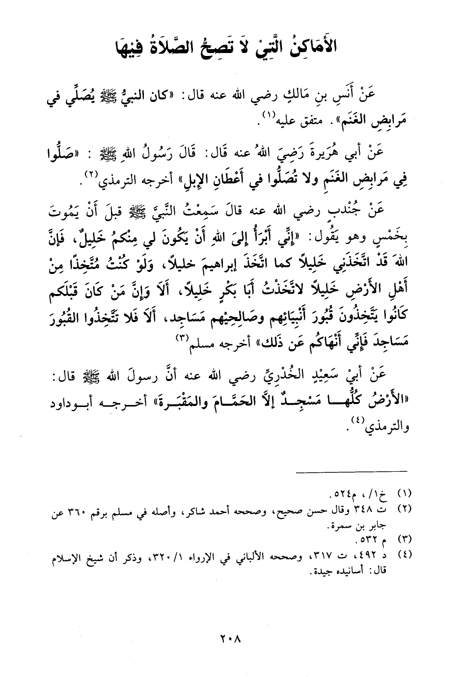 عن أبي سعيد الخدري رضي الله عنه أن رسول الله صلى الله عليه وسلم قال: "الأرض كلها مساجد إلا الحمام والمقبرة" أخرجه أبو داود والترمذي (¬4).