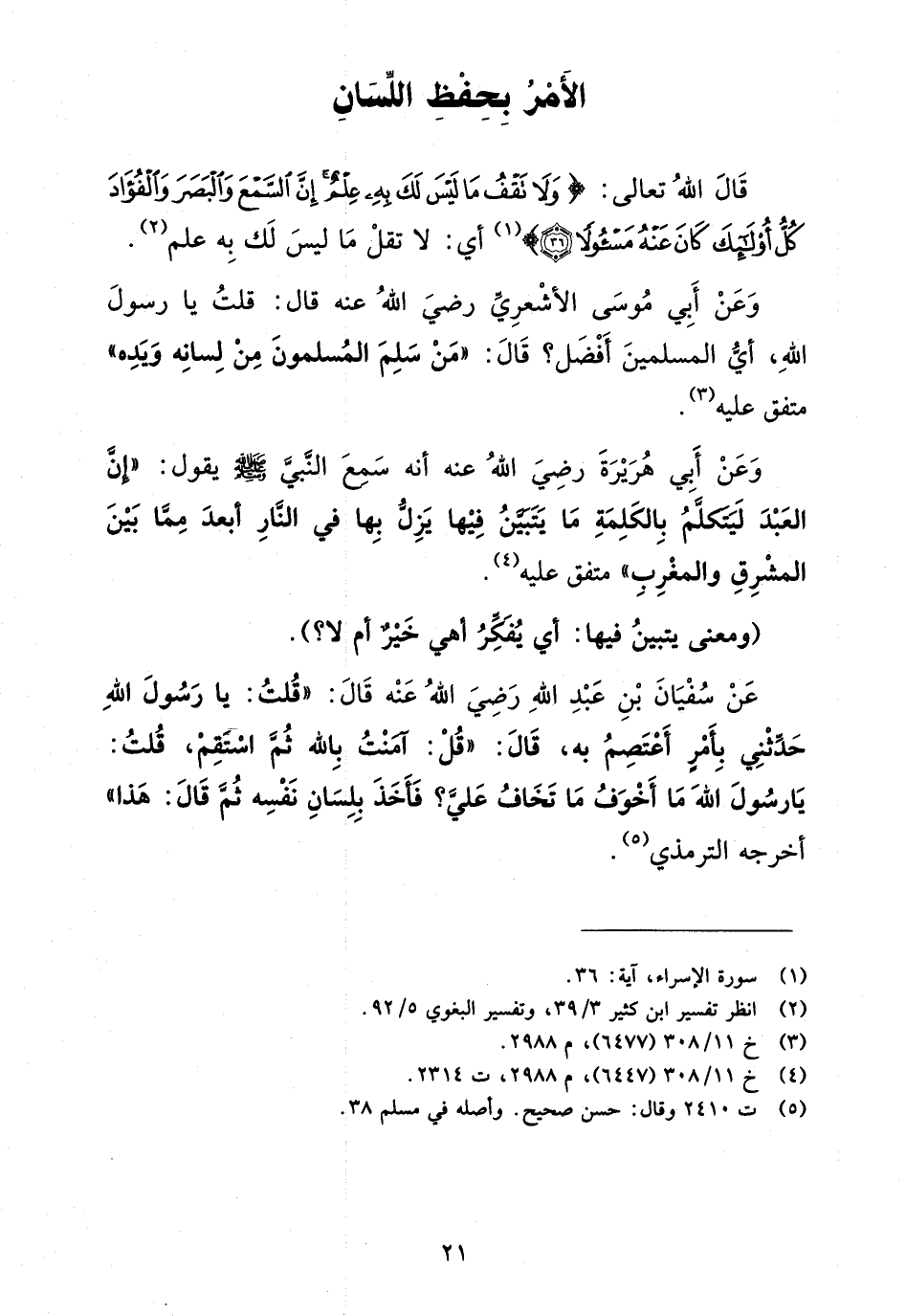 عن سفيان بن عبد الله رضي الله عنه قال: "قلت: يا رسول الله حدثني بأمر أعتصم به، قال: "قل: آمنت بالله ثم استقم، قلت: يا رسول الله ما أخوف ما تخاف علي؟ فأخذ بلسان نفسه ثم قال: هذا"أخرجه الترمذي (¬5).