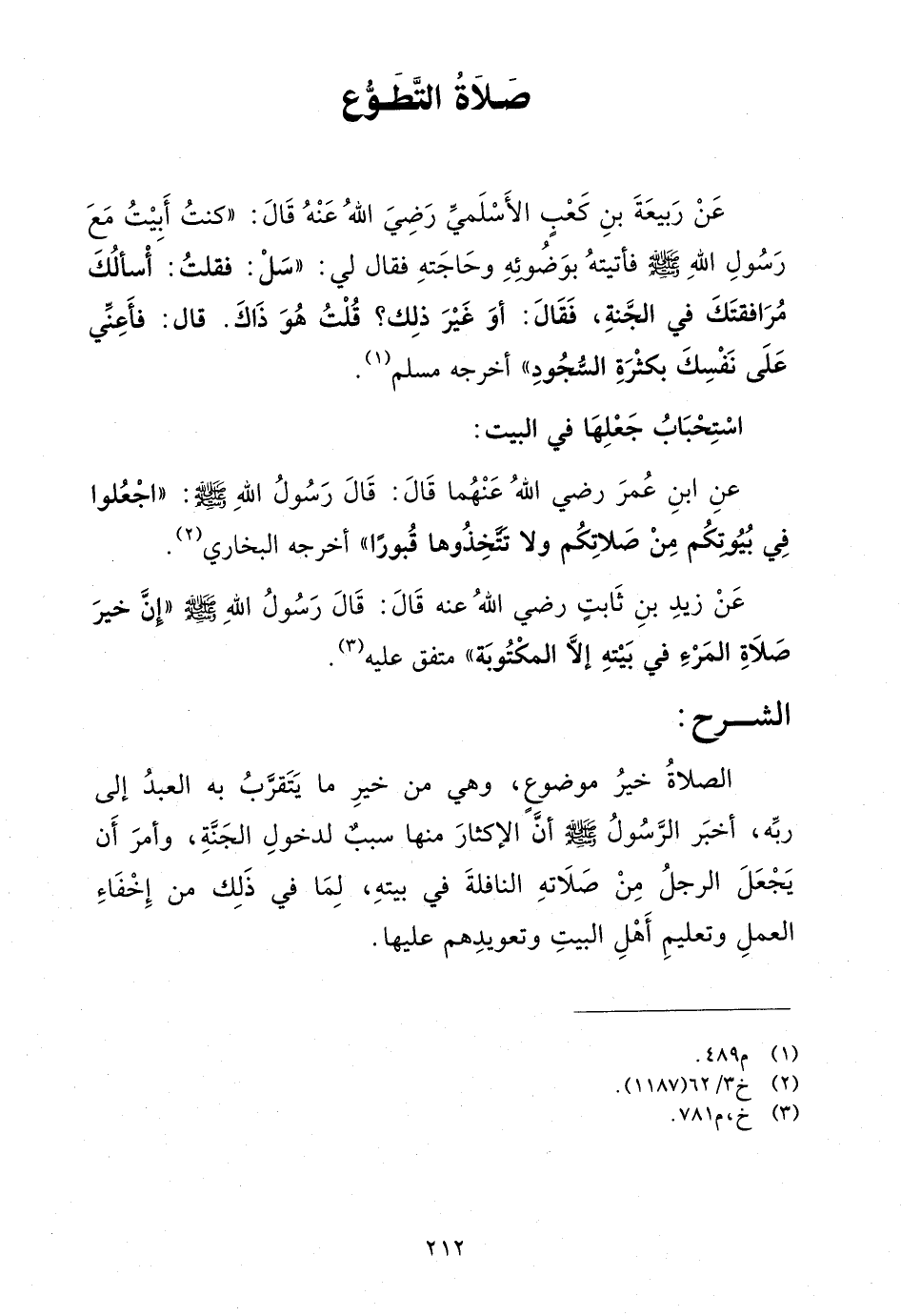 عن زيد بن ثابت رضي الله عنه قال: قال رسول الله صلى الله عليه وسلم: "إن خير صلاة المرء في بيته إلا المكتوبة" متفق عليه (¬3).