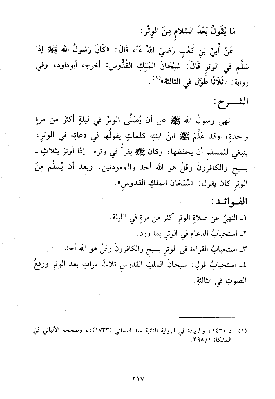 - استحباب قول: سبحان الملك القدوس ثلاث مرات بعد الوتر ورفع الصوت في الثالثة.