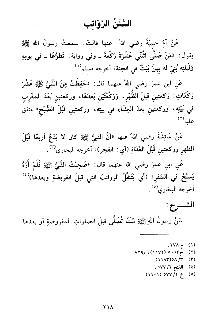 عن ابن عمر رضي الله عنهما قال: "حفظت من النبي صلى الله عليه وسلم عشر ركعات: ركعتين قبل الظهر، وركعتين بعدها، وركعتين بعد المغرب في بيته، وركعتين بعد العشاء في بيته، وركعتين قبل الصبح" متفق عليه (¬2).