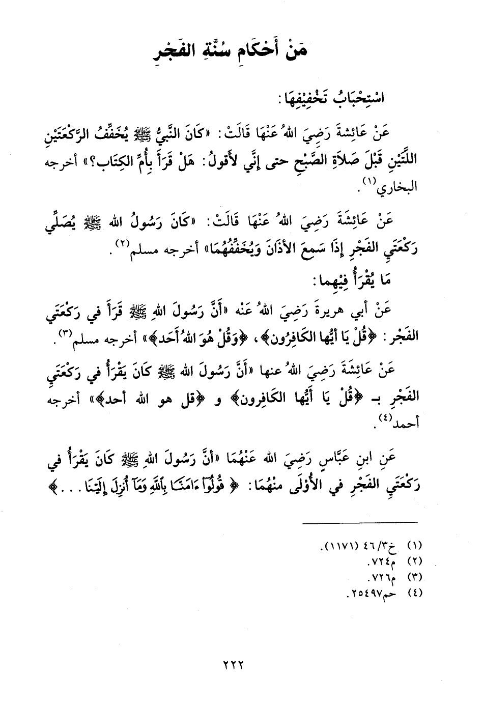 عن عائشة رضي الله عنها "أن رسول الله صلى الله عليه وسلم كان يقرأ في ركعتي الفجر بـ {قُلْ يَا أَيُّهَا الْكَافِرُونَ}، و {قُلْ هُوَ اللَّهُ أَحَد} "أخرجه أحمد (¬4).