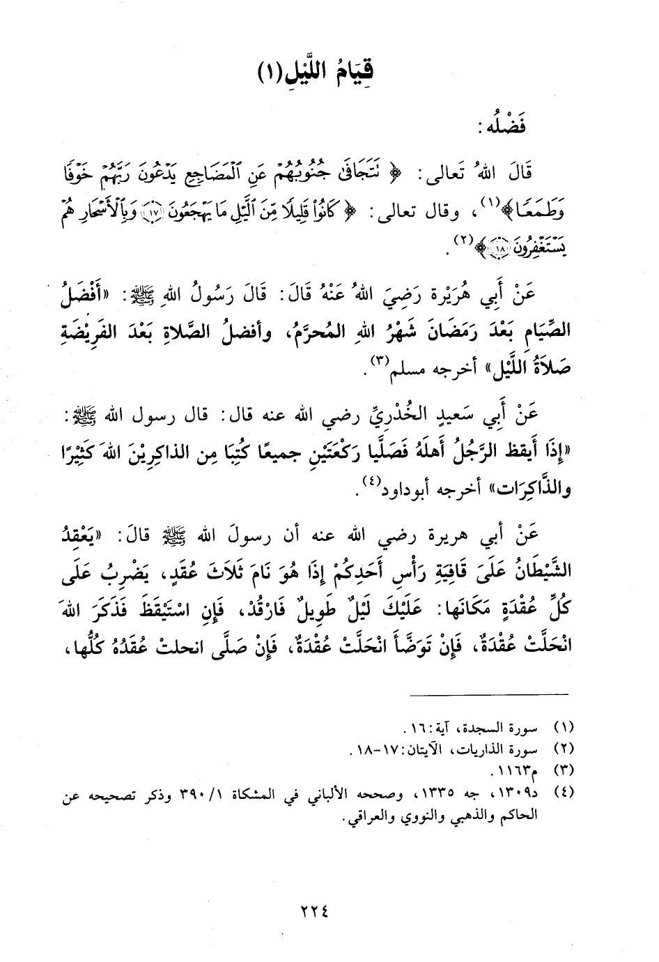 عن أبي هريرة رضي الله عنه أن رسول الله صلى الله عليه وسلم قال: "يعقد الشيطان على قافية رأس أحدكم إذا هو نام ثلاث عقد، يضرب على كل عقدة مكانها: عليك ليل طويل فارقد، فإن استيقظ فذكر الله انحلت عقدة، فإن توضأ انحلت عقدة، فإن صلى انحلت عقده كلها،